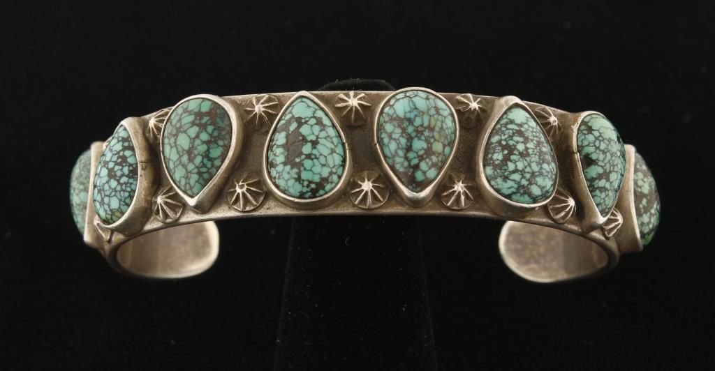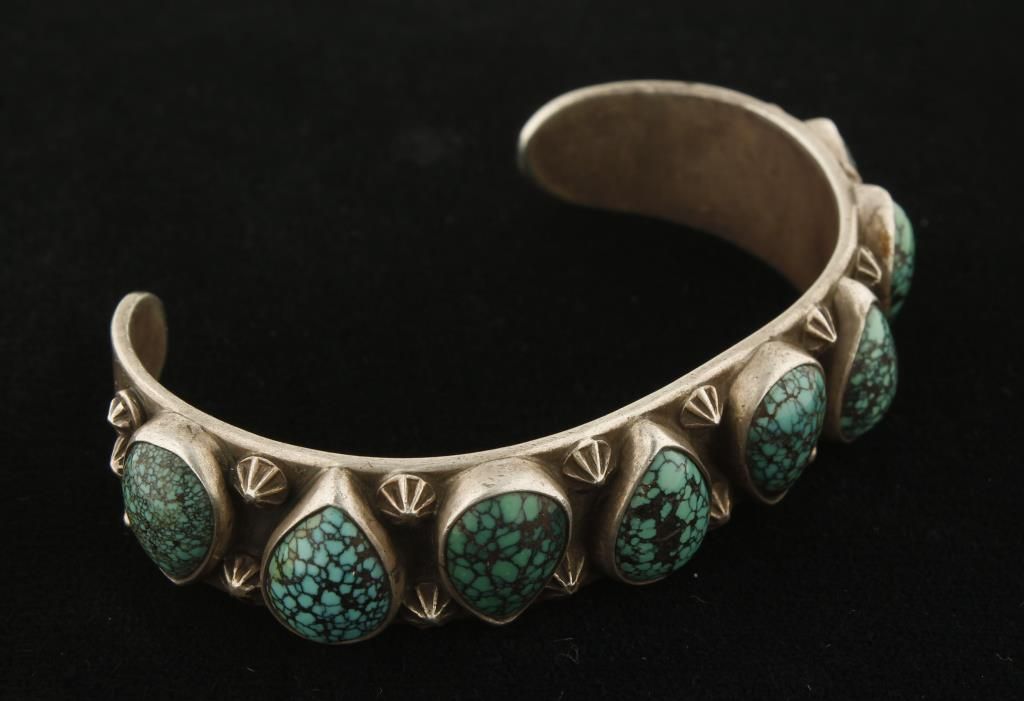 (8) Tear drop cut turquoise stones with nice matrix set in sterling silver, with concho accents. Unmarked. Approx 2-1/2" inside measurement with 1-1/2" gap.