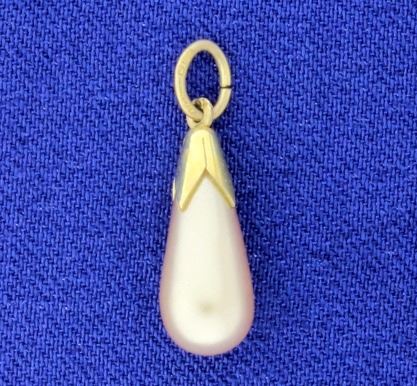 In 9K yellow gold, the pendant is 3/4 inch long and the pearl is about 15mmx6mm. .8g