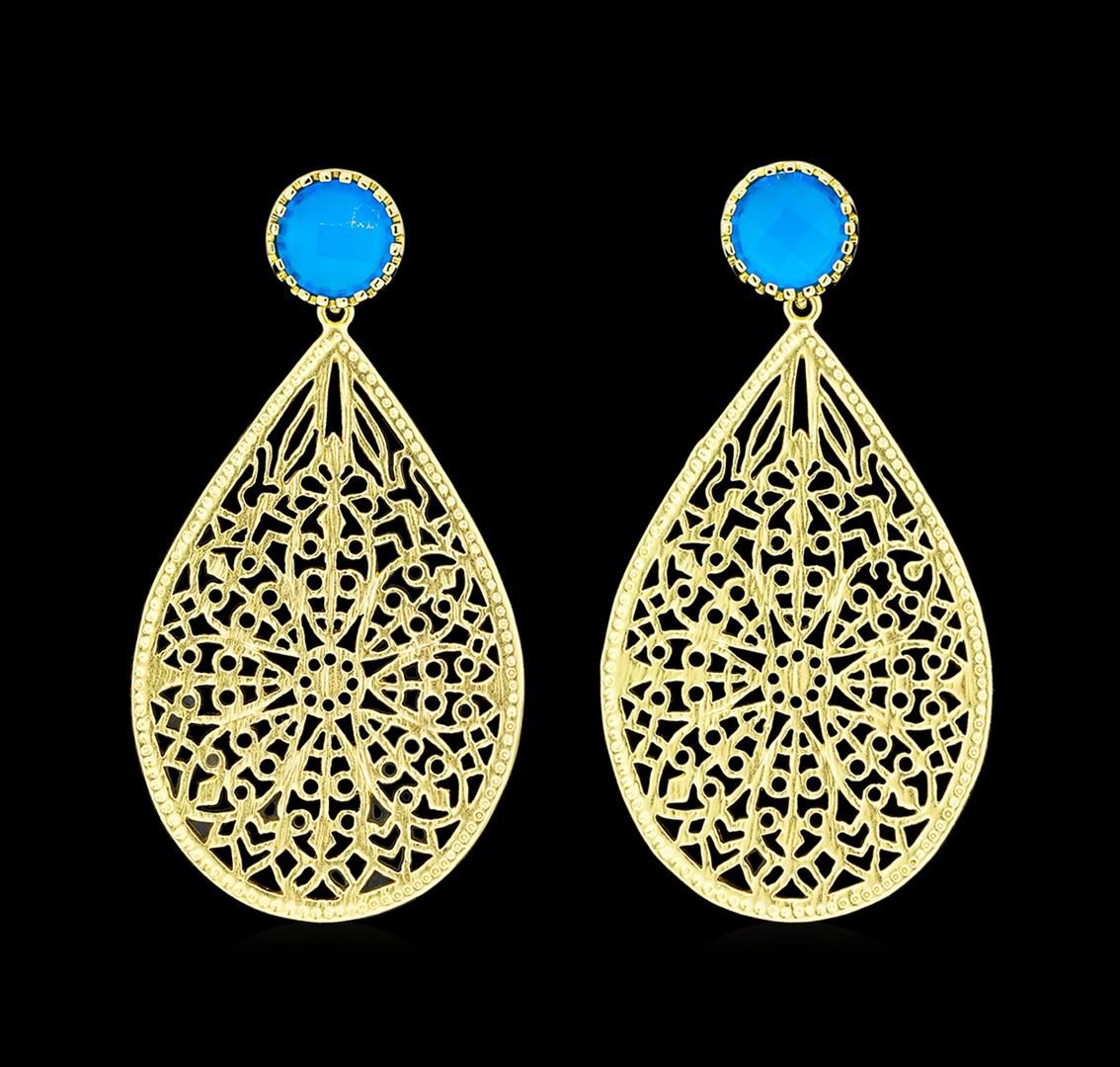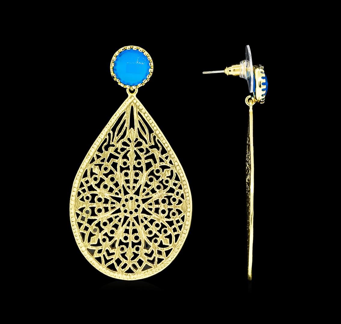 High end designer jewelry. Teardrop Filigree Stone Earrings - Gold Plated. Gold Plated Metal. Gold/ Blue. Post. Total Weight: 10 grams.