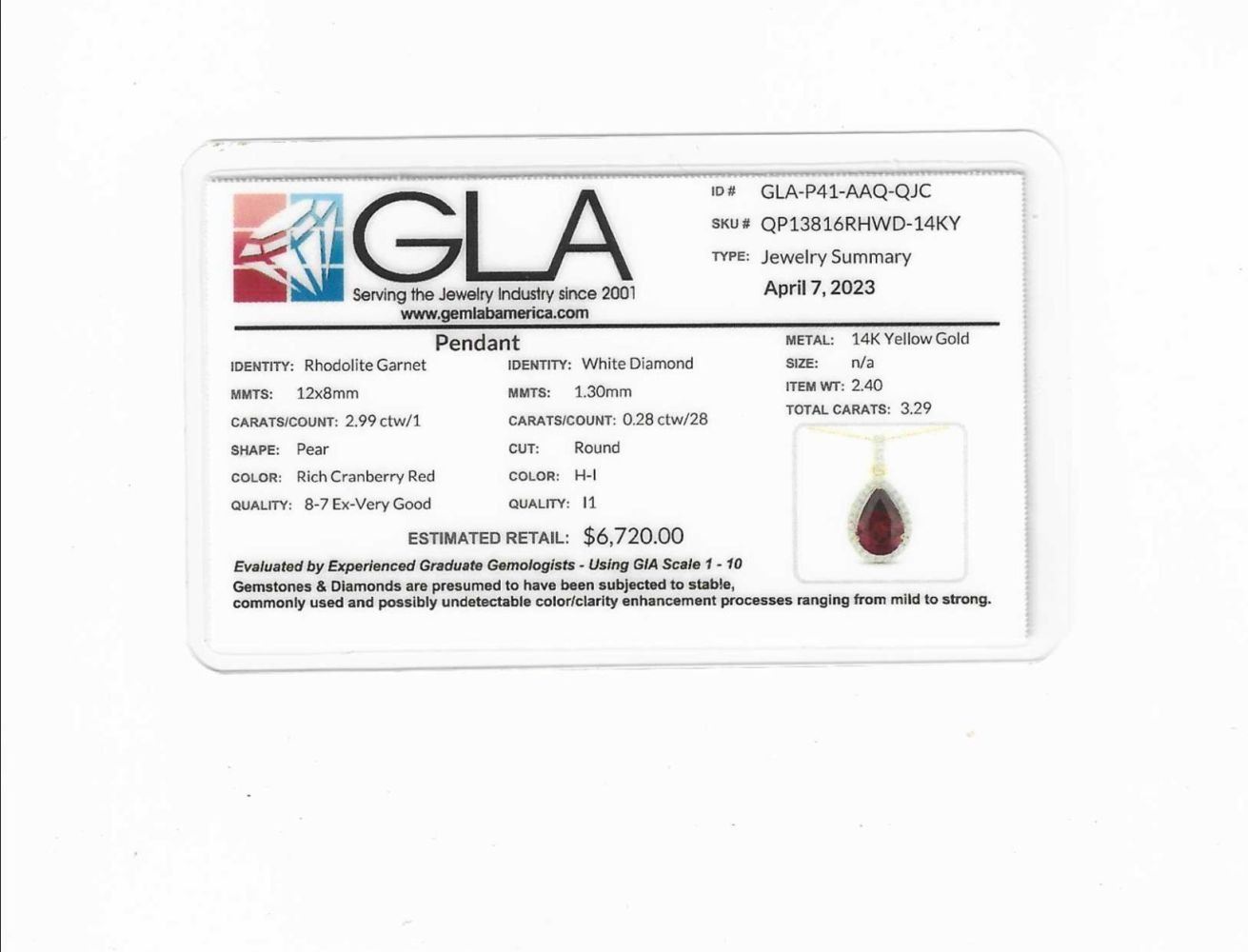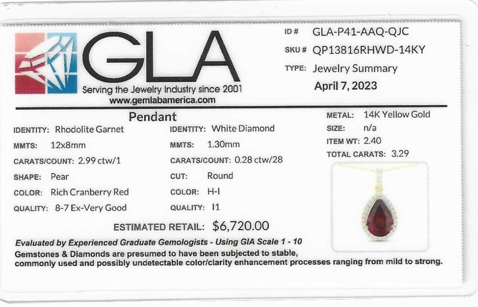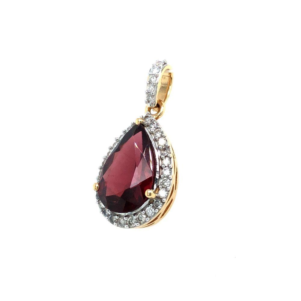 Genuine Garnet and Earth-Mined Diamond Pendant. This is a 14 karat yellow gold pendant that features a 2.99 carat pear-shaped rhodolite garnet that resembles a sparkling Lambrusco! There is .28 carats of round, brilliant-cut, H-I color, I1 clarity diamonds in the halo and bail of this gorgeous pendant. There is no chain for this item. This pendant is certified and appraised for $6,720.00 estimated retail replacement value. CHECK OUT THE MATCHING RING IN LOT 15!