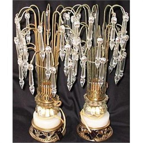 A pair of teardrop waterfall lamps in good working order. Teardrops are glass, not plastic. Metal base with a 1" thick round solid marble on top. Measures 17" tall. Requires an oblong light blub. Brass is dull and some teardrops need straightening but otherwise in good condition.