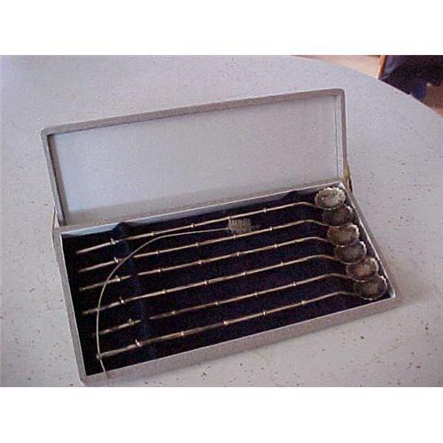 (6) sterling teaspoons, sippers, 9" Long, 1 1/8" embossed diameter spoons, fluted with brush for cleaning, also in original box; 4.75" A 9 .75"; hinged cover, sticker on bottom of box--Eport standard JIS S-2014 T.E. P.A.; good condition, ready for use.