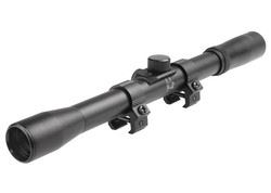 Rifle scope 4x magnification 20mm objective lens .75" tube Duplex reticle 1.50" eye relief 4 oz. 10.75" long Includes 11mm rings with crossbars