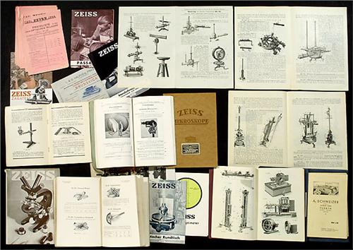 Technical Literature about "Optics" 1) 3 catalogues about scientific and precision instruments by Edelmann, Munich (1907), Krüss, Hamburg (1908), and Alig & Baumgärtel, Aschaffenburg (c. 1900). - And: 3 price lists for Wild's terrestrical magnetism apparatus. - 2) 3 microscope catalogues, by Zeiss, Jena (Mikro 1, Mikro 375 and Mikro 400) with approx. 17 other Zeiss brochures or lists. - 3) Catalogue about magnifying glasses by Schweizer, Fürth (List L 35). - And: 4) Leaflet "Brunsviga" calculating machine.<Br>
