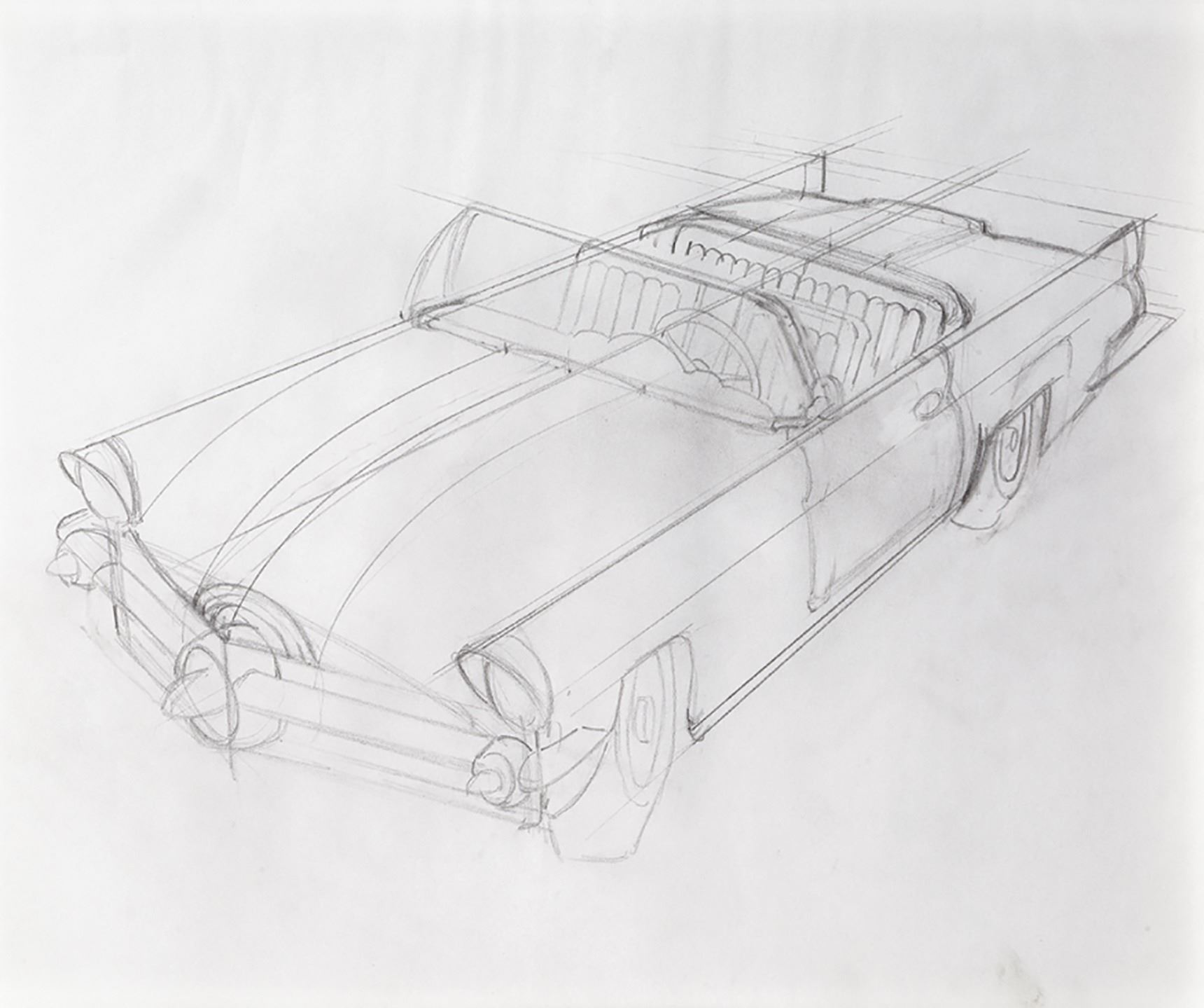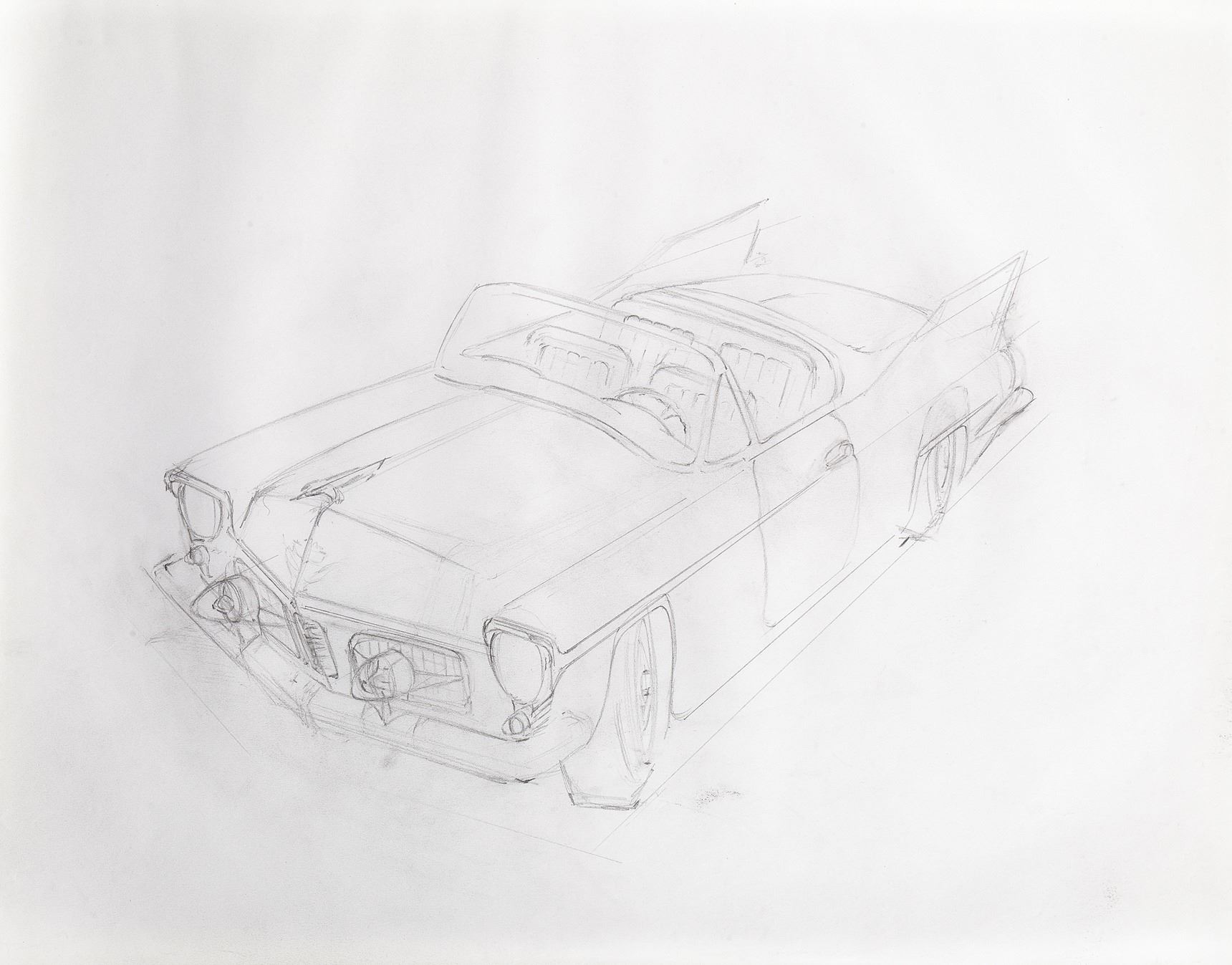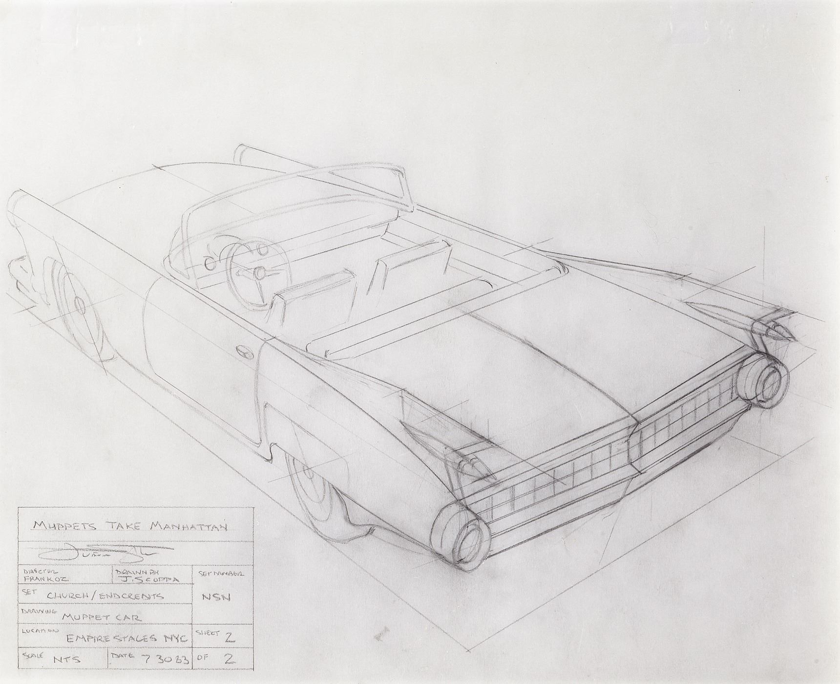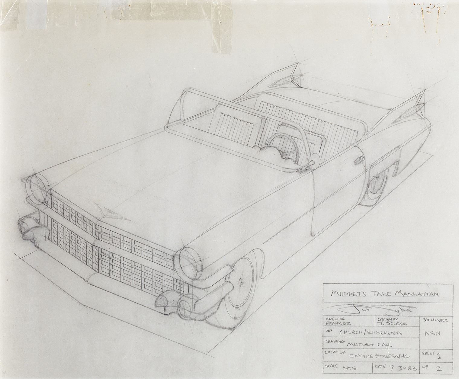 355. Technical drawings of The Muppet car from The Muppets Take Manhattan. (TriStar, 1984) A collection of (40+) sketches and schematics for the "Muppet Car" from Muppets Take Manhattan. Sketches range in size from 12 x 8 in. to 23 x 18 in. and are accomplished in pencil and colored pencil on vellum. Depicting various car designs and angles from full sketches of the vehicle to details like bumpers. Lights ands hood ornaments. Also includes one schematic sketch of a "Grocery Bike". Accompanied by (15) 6x 4 in. color snapshots of the resulting car and set decorator/car designer Justin Scoppa and crew. All materials in production-used, vintage very good to fine condition. $300 - $500