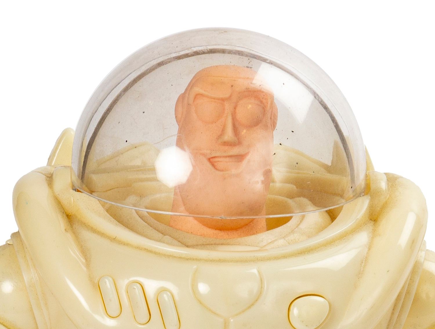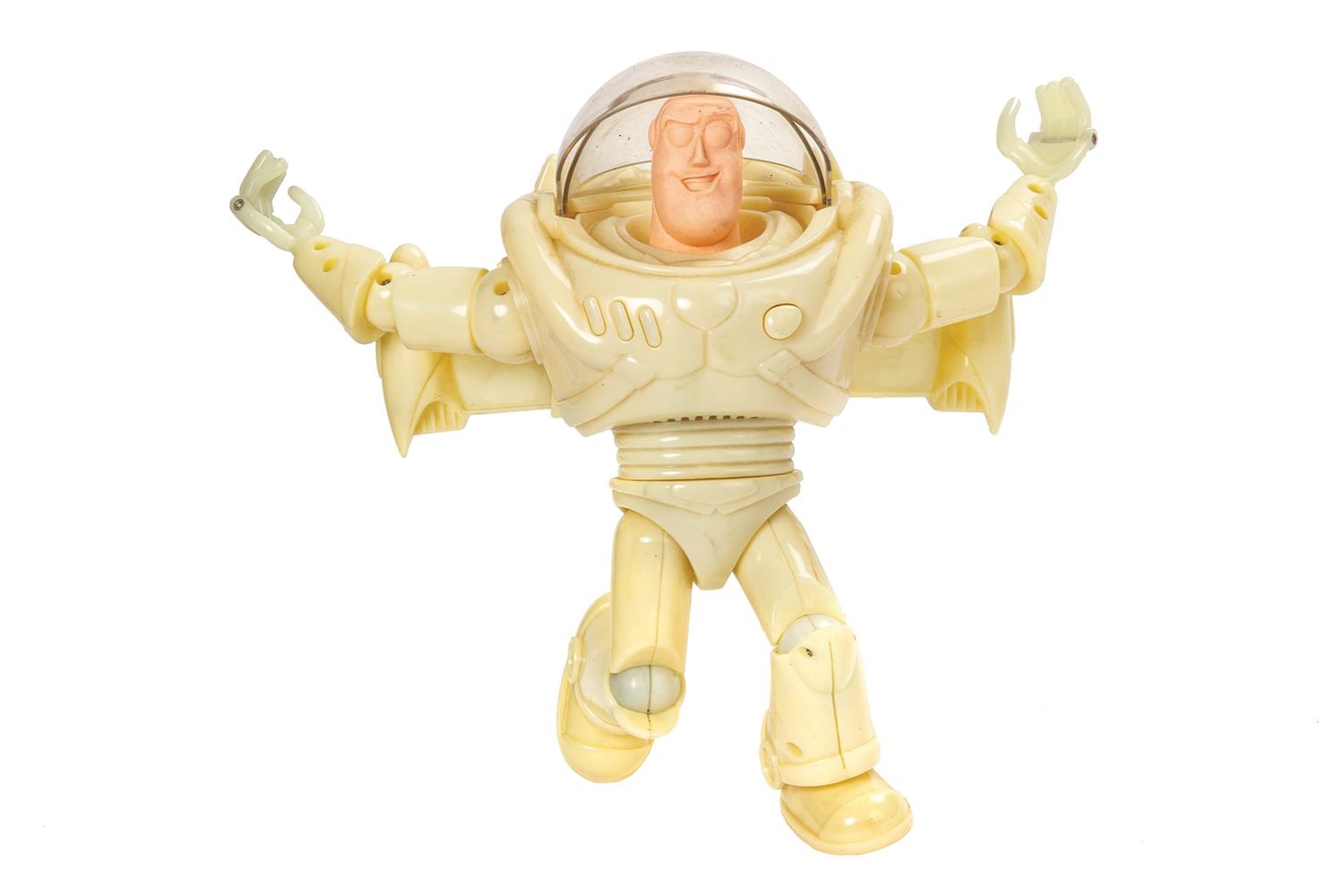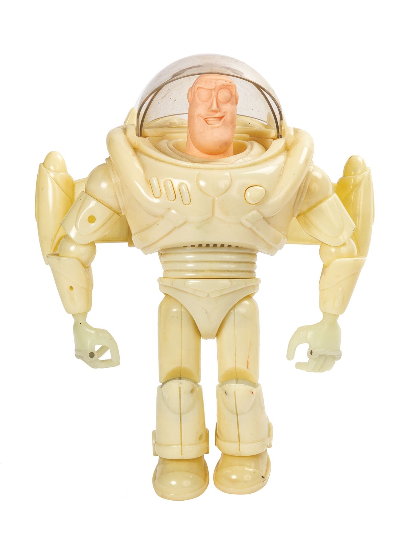 (Disney, c.1999) A rare prototype for the Toy Story 2 Techno-Gear Buzz Lightyear toy. A few alternate versions of Buzz were created in response to the popularity of the character, with this Techno-Gear variant featuring slightly different designs along his wings and chest. This unpainted prototype is articulated, posable, and has a retractable helmet and wings. Measuring 12" tall, the prototype is in very good overall condition with some scuffs and wear throughout from use. The figure does not contain electronics, but wonderfully represents this iconic character.