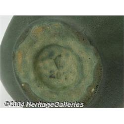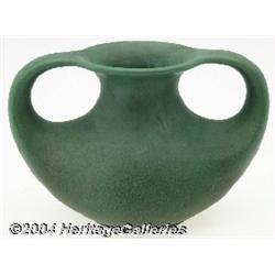 Teco: <B>AN ARTS AND CRAFTS AMERICAN POTTERY VASE (Teco) </B></I><BR>Teco, c.1910<BR><BR>With looped handles and forest green matte glaze, stamped signature <I>Teco</B></I><BR>5.5in. high <BR><BR><B>Important notice:</B> Heritage usually auctions material at the rate of 200-250 lots per hour. On some occasions eBay Live bid software or the Internet may not be able to keep up with the pace of the auction. We recommend placing a realistic absentee bid now as insurance to avoid disappointment. Occasionally the auctioneer may eliminate or reject an eBay Live bid, and the auctioneer may also reopen a lot after the close of the eBay live bidding (usually because we missed an audience bid), and may reject your bid even if it shows you as the winning bidder. By bidding via eBay Live, you agree that Heritage may award the lot to another bidder at its sole discretion under the circumstances described above or any other reasonable circumstances. Since eBay bids are not shown to us until we open the lot on the floor, we treat those bids just like floor bids. In most cases the floor responds before the eBay bid is presented to us, due to Internet lag time, so for consistency we have made it a policy that floor bids are always considered first over tie eBay live bids. Also please note that all Heritage lots purchased through eBay Live carry a 24.5% Buyer's Premium. Please make sure you read the Terms and Conditions before you bid.