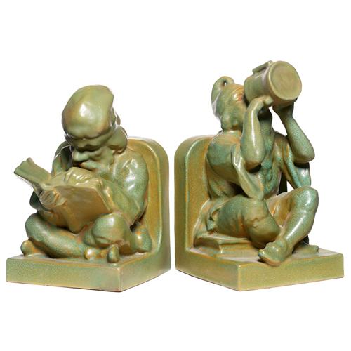 Teco bookends, attribution, gnomes covered in a green and brown matt, unmarked, tallest is 9in.h, repairs to both