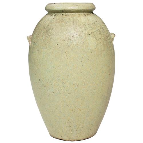 Teco oil jar, #623, large classical outdoor form in a mottled light green glaze with applied handles and a rolled rim, chips and discoloration, 21"w x 30"h, good condition