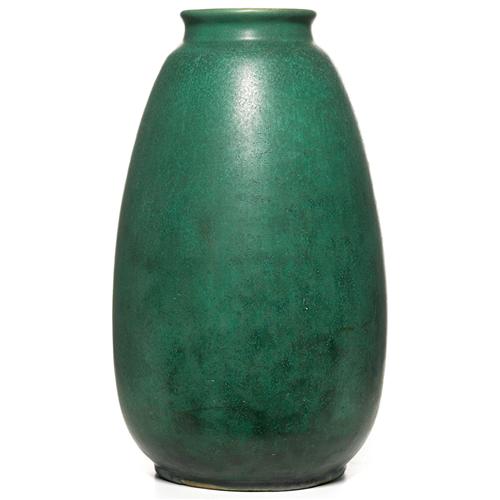 Teco vase, large bulbous form under a good green and charcoal matt glaze, impressed marks, 13"h, restored chip to rim and foot