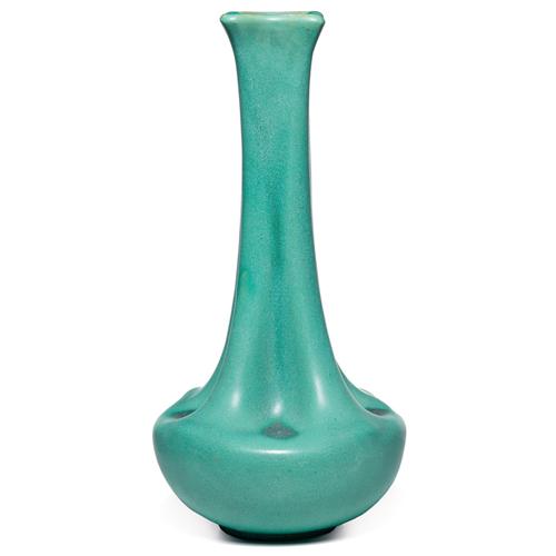 Excellent Teco vase, shape 182, organic form covered in a good dark green matt glaze, impressed marks, designed by F. Albert, 16"h, a great example of this form