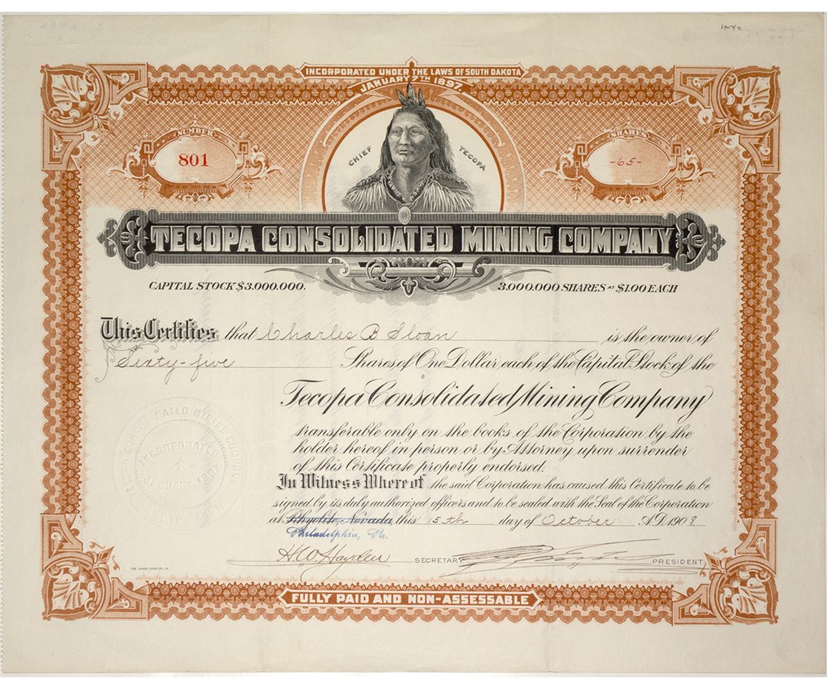 Uncancelled stock certificate, No. 801, issued to Charles B. Sloan, 65 shares of capital stock, signed by (illegible), President and H. W. Hayden, Secretary. very good condition, beautiful vignette of chief Tecopa. From 1912 to 1928 the Tecopa Consolidated Mining Company produced $3,000,000 worth of silver and lead. After World War II these mines, inactive during the Depression, were purchased by the Anaconda Copper Mining Company, who operated them with a crew of 45 men until March, 1953, when the mine closed down. No high grade ore reserves were found after exploration by the Anaconda company.