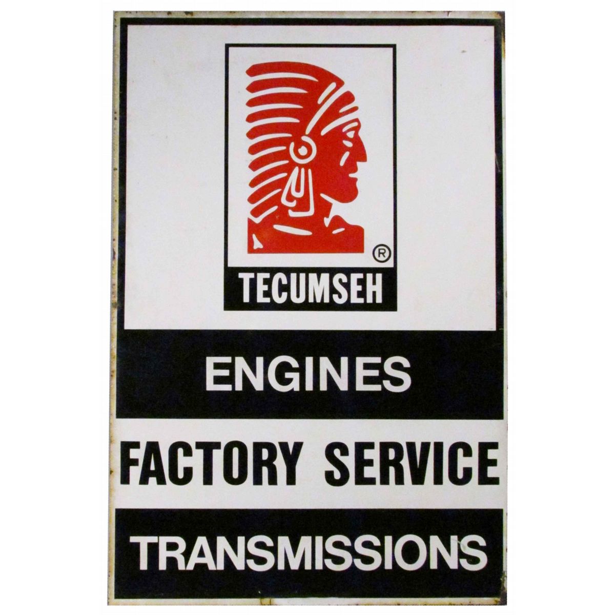 Tecumseh Engines Factory Service Steel Flange Sign, two sided. Scratch at 3:00 on one side and edge ware otherwise good condition. 16 X 24 inches.