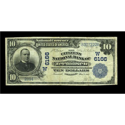 <B>Tecumseh, NE</B></I> - $10 1902 Date Back Fr. 616 <B>The Citizens NB</B></I> Ch. # (W)6166<BR>This is a very rare note from a very rare town which saw three banks chartered, the longest lived of which lasting only until 1916. One is unknown, the second represented by just one note, and the third, this institution, has all of three specimens reported. The Gengerke data shows just two prior offerings from here during the past sixty years, with one of them this very note. <B>Very Fine.</B></I>