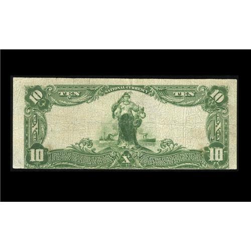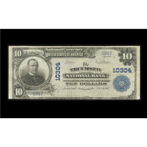 <B>Tecumseh, OK</B></I> - $10 1902 Plain Back Fr. 629 <B>The Tecumseh NB</B></I> Ch. # 10304<BR>A very scarce large size note from the only truly collectible bank in this small town. <B>Very Good,</B></I> with the bottom margin trimmed close and a couple of minor edge splits that affect little.