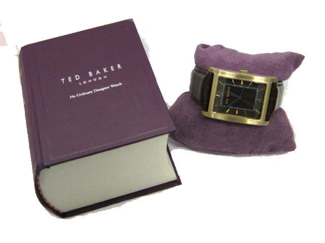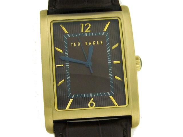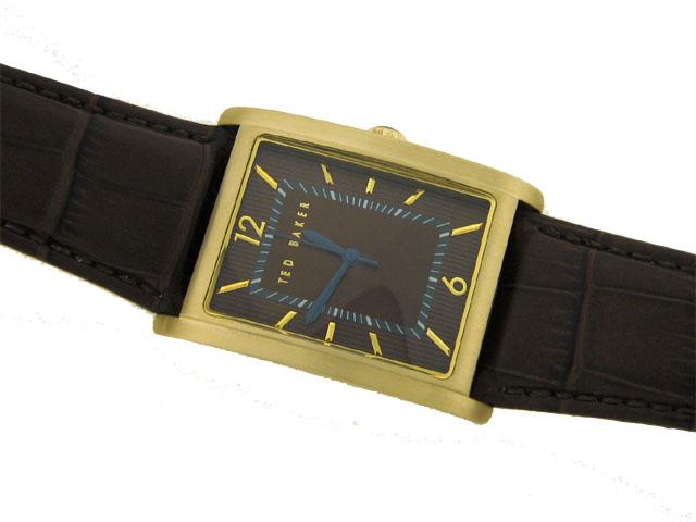 This is a Ted Baker Men's TE1008 Sui-Ted 3-Hand Analog Leather Strap Watch with the following features: Casual watch; Quartz movement; Brushed turquiose hands; Polished gold-tone numbers and markers; Brushed silver-tone markers and indices; Brushed gold-tone stainless steel rectangular case; Polished gold-tone stainless steel turquoise caboche crown; Polished silver-tone stainless steel caseback and 30 meters/100 feet water resistant