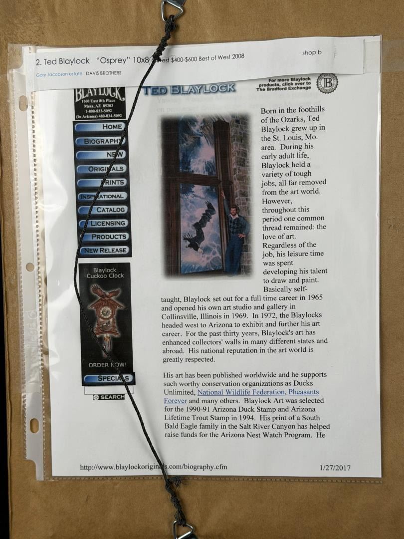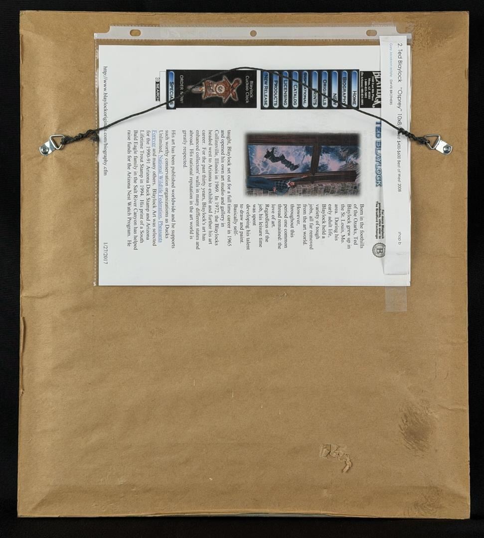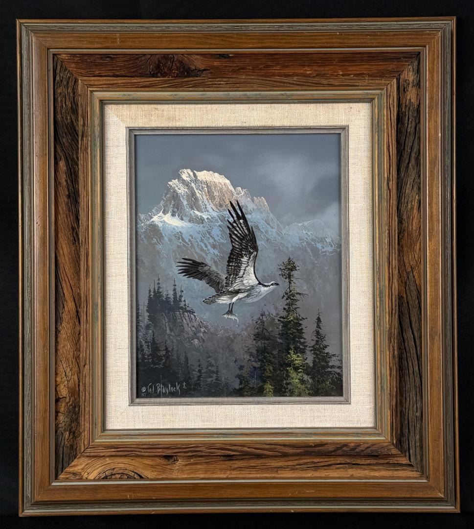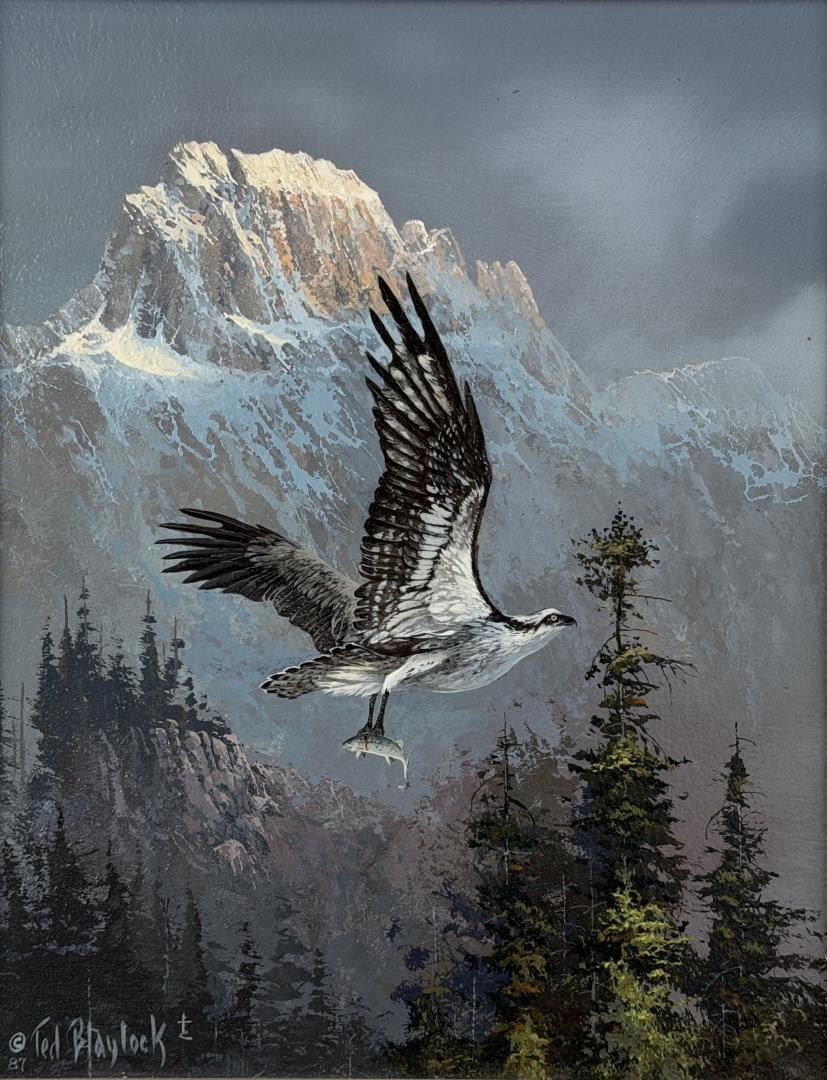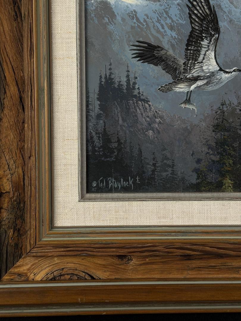 Title is Osprey. 8" by 10" unframed. 16" by 18" framed. Oil on Board. Ted Blaylock (1940 - 2022) was active/lived in Arizona, Illinois. Ted Blaylock is known for Wildlife, birds, genre, views, sculptor. Ted Blaylock opened his own art studio and gallery in Collinsville, IL in 1969. He eventually moved west to Arizona and for the past thirty years, his art has graced many collectors' walls and has been published worldwide. Blaylock was selected for the 1990-1991 Arizona Duck Stamp and the Arizona Lifetime Trout Stamp in 1994. He was also selected to show with the top 100 Artists for the National Parks and Birds in Art and has a permanent display in the Leaning Tree Museum of Western Art. Courtesy, Best of the West Auction, Colorado Springs, CO