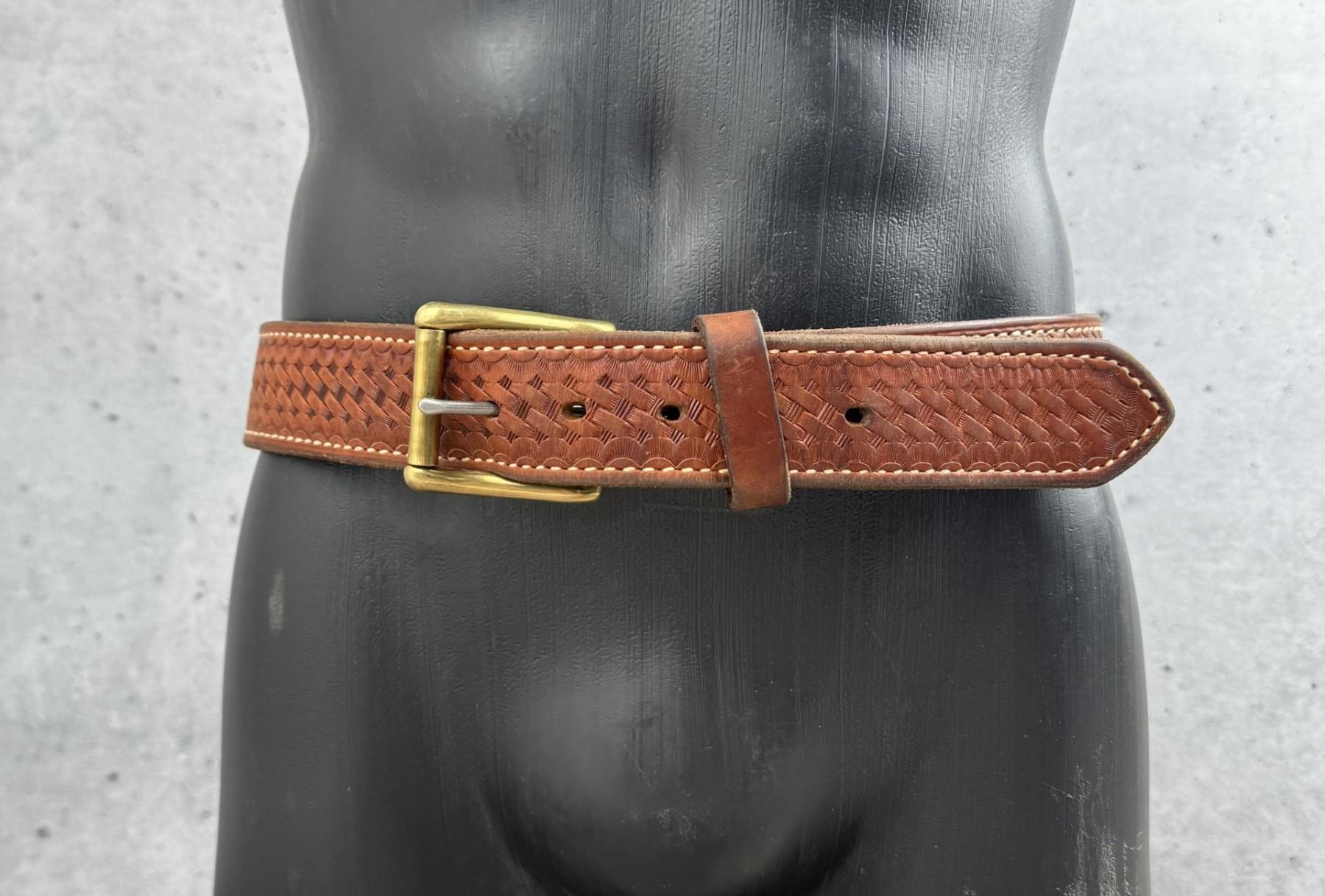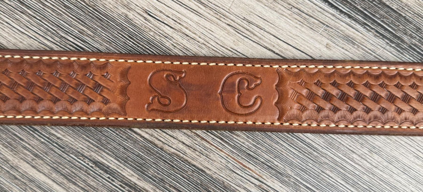 Size 36. 43" from tip to end of buckle. Customized SC