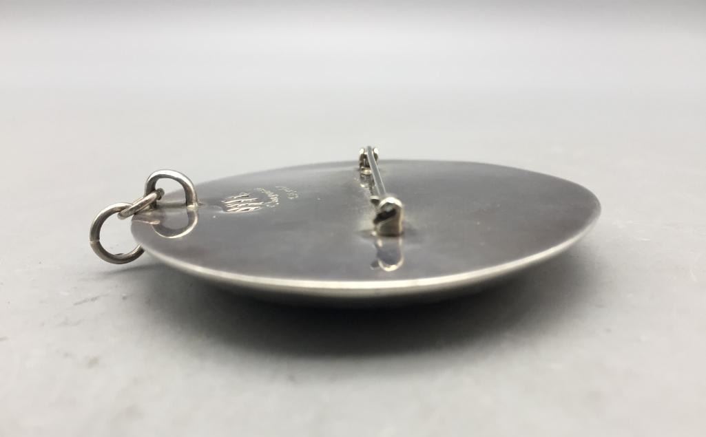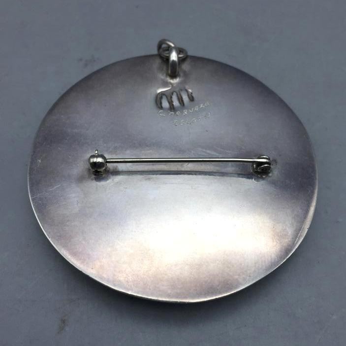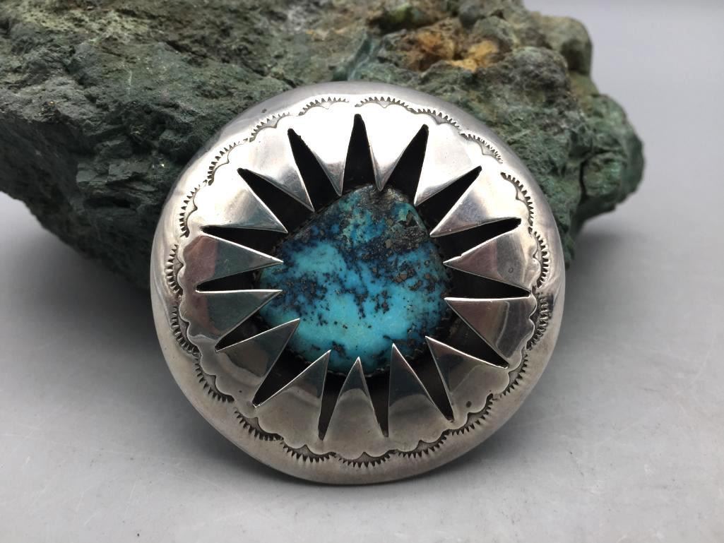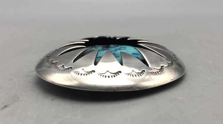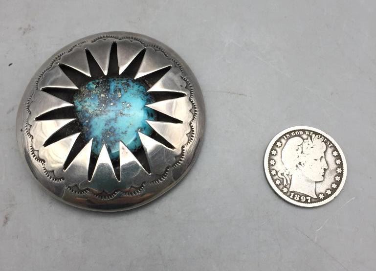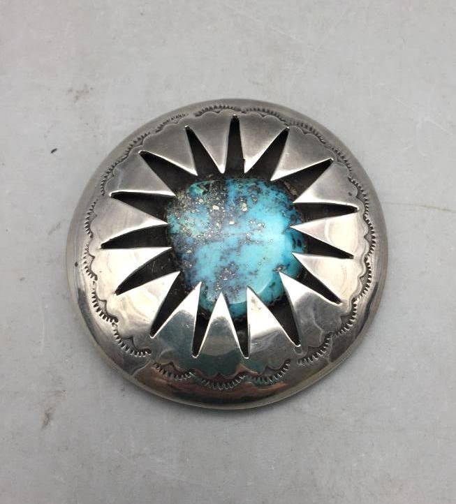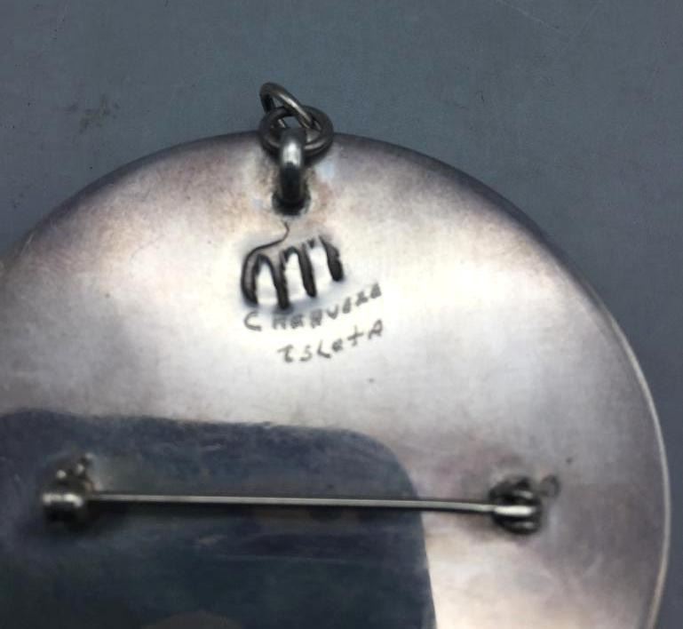 Presented for sale in this lot is a unique looking pin/pendant. It has a shadow box style set with a great turquoise stone in sterling silver. Maker: Ted Charveze (1936-1990; Isleta) Active 1960s-1990. Approx. Age: Vintage. Size:2-1/4" long X 2-1/4" wide. Weighs 32.8 grams. Condition: Good for its age, normal wear expected. Please look closely at the pictures - they are an important part of our description. Shipping: There will be a $5 handling, packaging fee for shipping this lot. The actual cost of postage will be added on top of that.