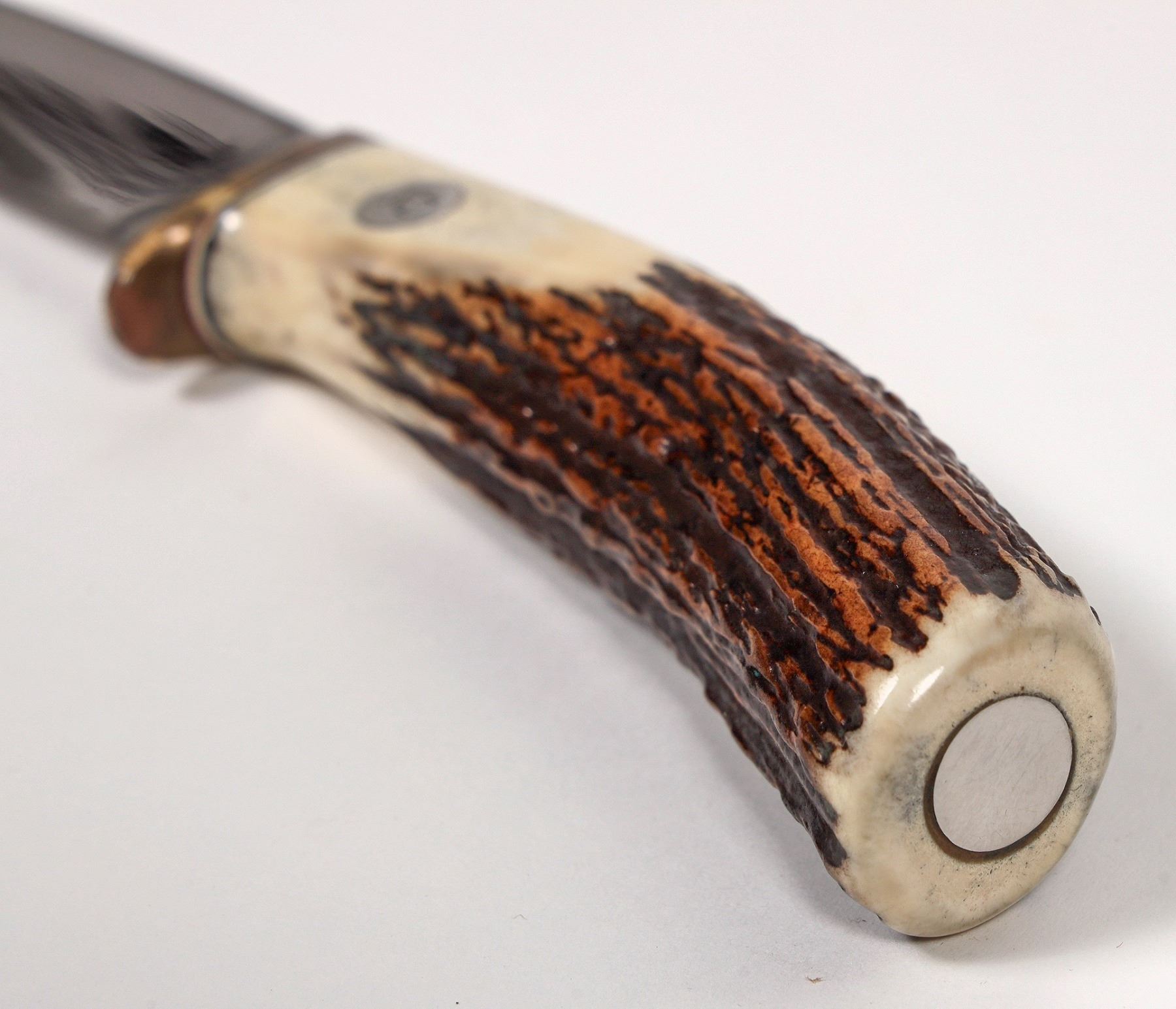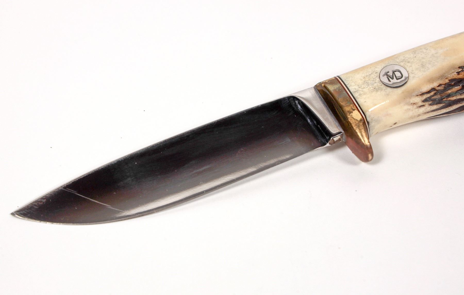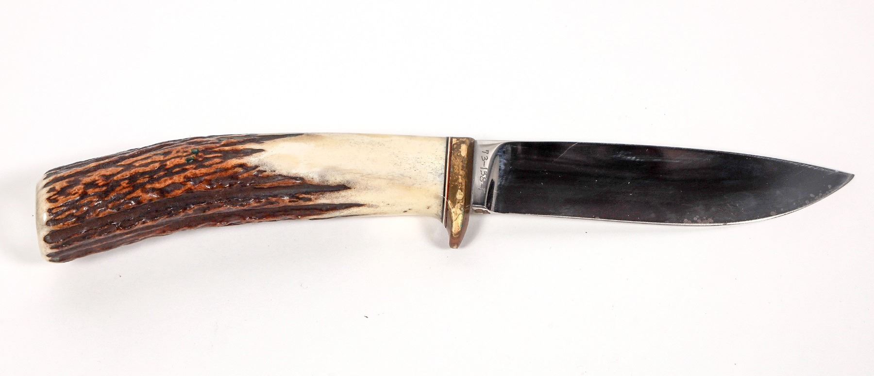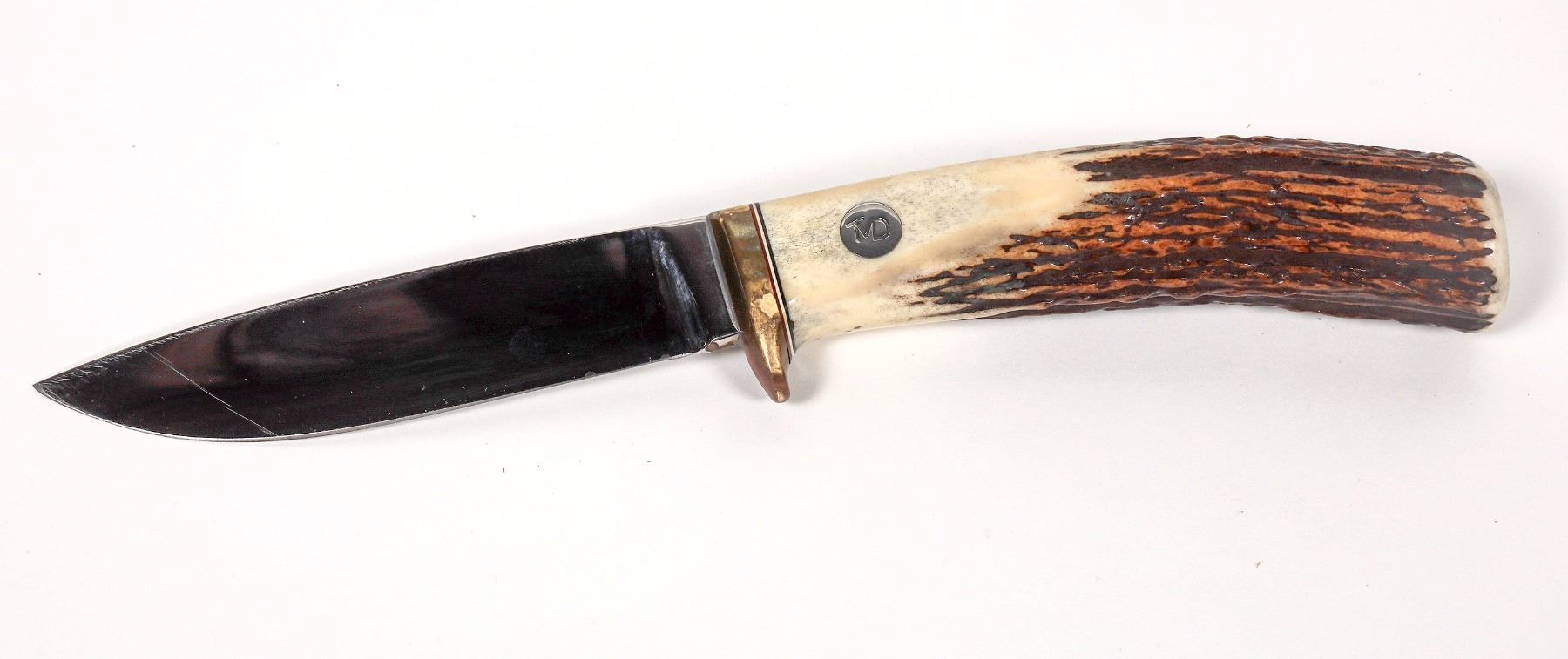 This knife is a Ted Dowel (1929-2012) custom hunter at 9.5 in. overall length, 5 in. handle with a 4.375 in. grade F stainless blade. There is a brass guard with three spacers: black, white, and red. The grip is stag, elk one-piece antler. The tang ends in a button at the pommel. There is the usual TMD button on the left side. The ricasso is marked "73-138-F" indicating a 1973 construct with Ferric stainless steel blade. There are several small spots on the blade right side near the edge; otherwise a highly polished steel blade. Spectacular craftsmanship in like new condition. A tarnished brass bolster/guard. The sheath has the usual TMD logo at the throat and is in like new condition. Please see photos for details.