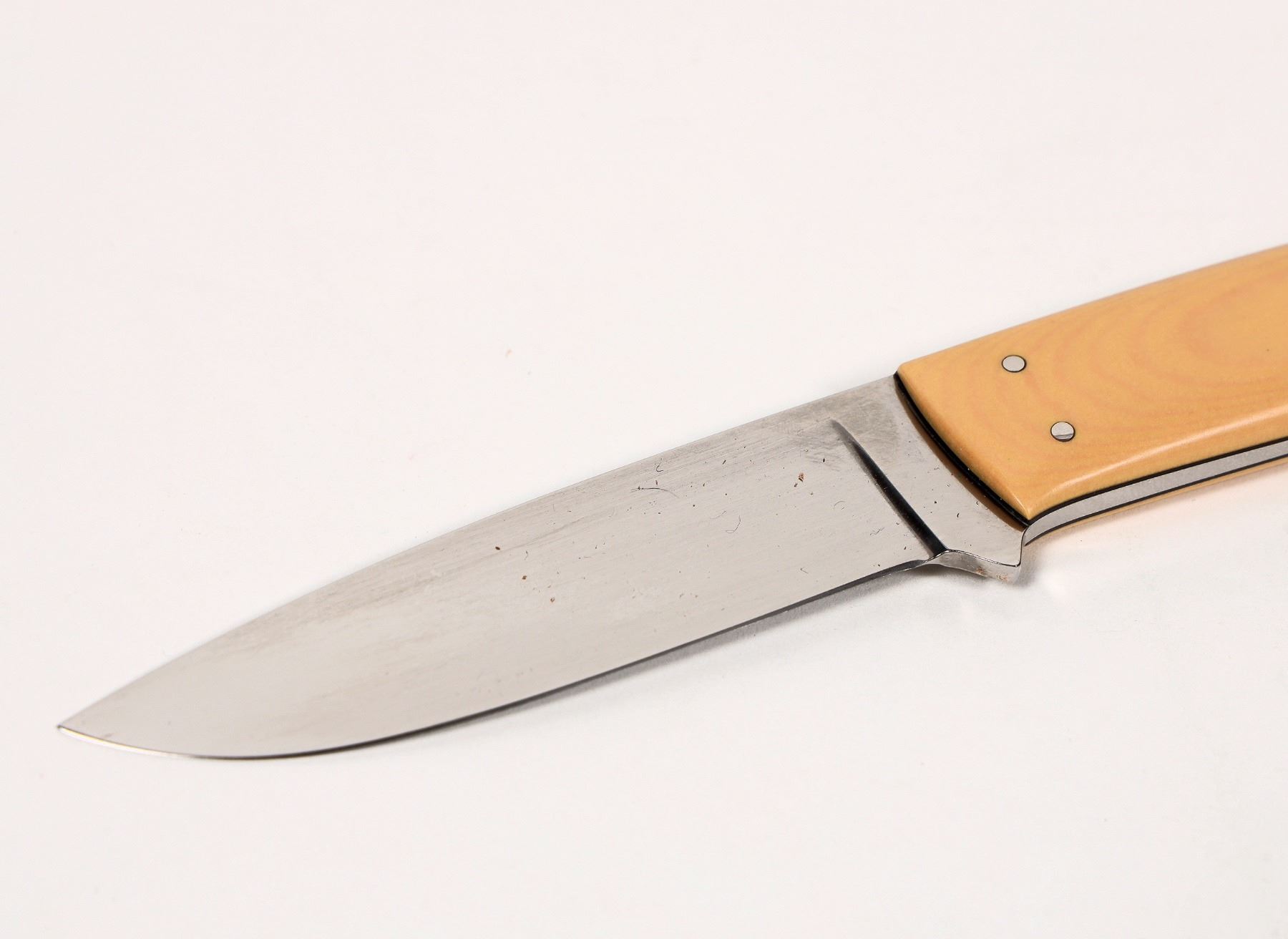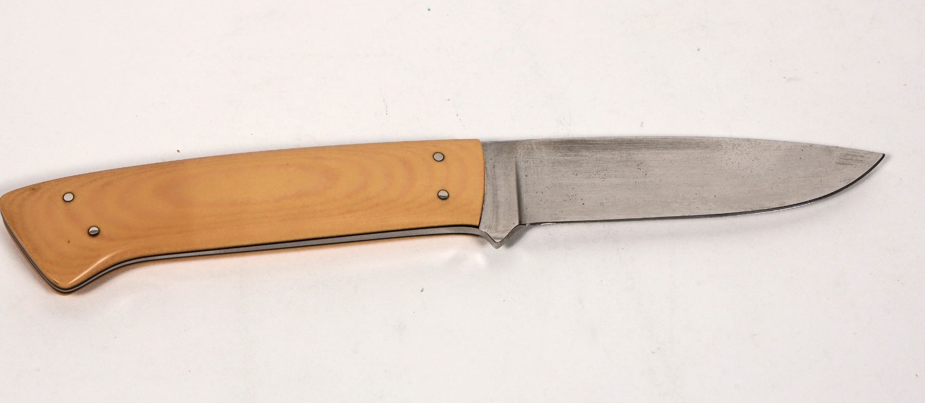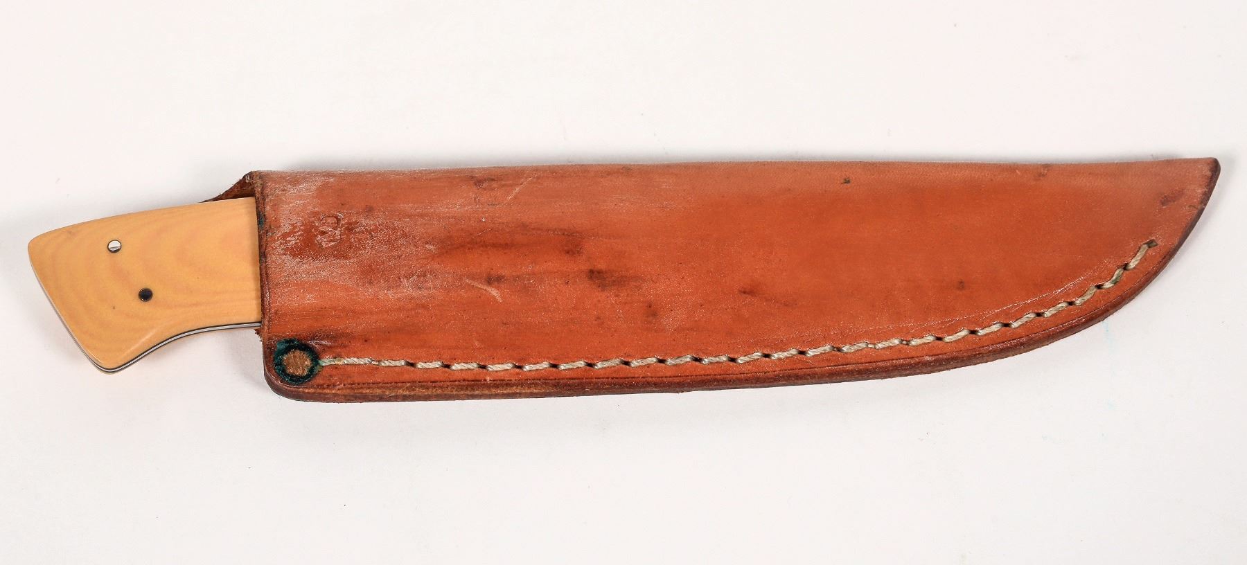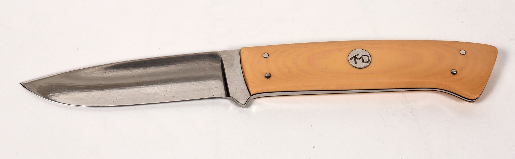 This knife was made by custom knife maker Ted Dowell of Bend, Oregon; (1929-2012). It appears to be a "lightweight" (at 2.6 oz.) made with D-2 or 440-C steel and ivory micarta scales flanked by thin black liners which adds to the three dimensional look and feel of the knife. It is a tang blade with four nickel silver pins. A makers mark TMD is in an oversized "button" on the left side. The blade is highly polished in a drop point with the ivory colored scales that fade at the back; a piece of mechanical art in your hand. New, never used with matching sheath also with the TMD logo at the throat. 7.750 in. overall length, 3.625 in. drop point blade highly polished. No other markings on the ricasso. Ted was a founding father of the Knife Makers Guild and first president of that guild and Hall of Famer of Cutlery Magazine. C. 1970s. Please see photo for details.