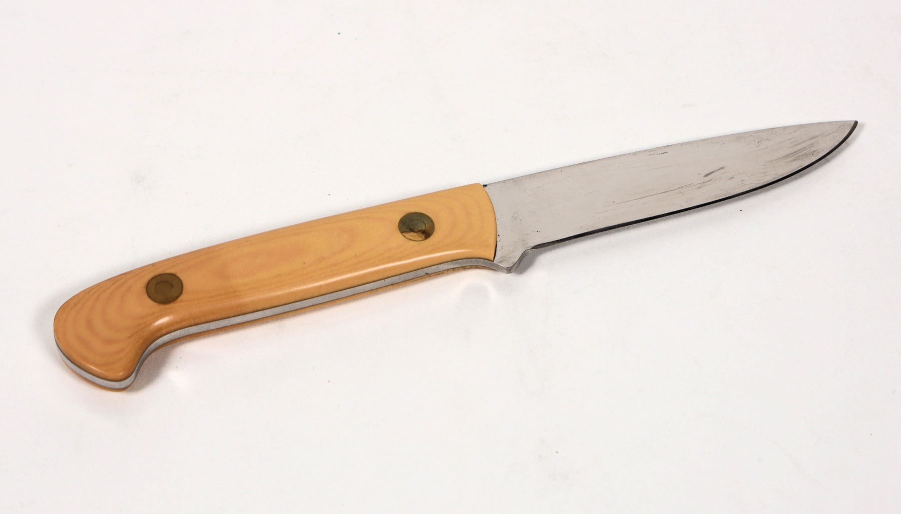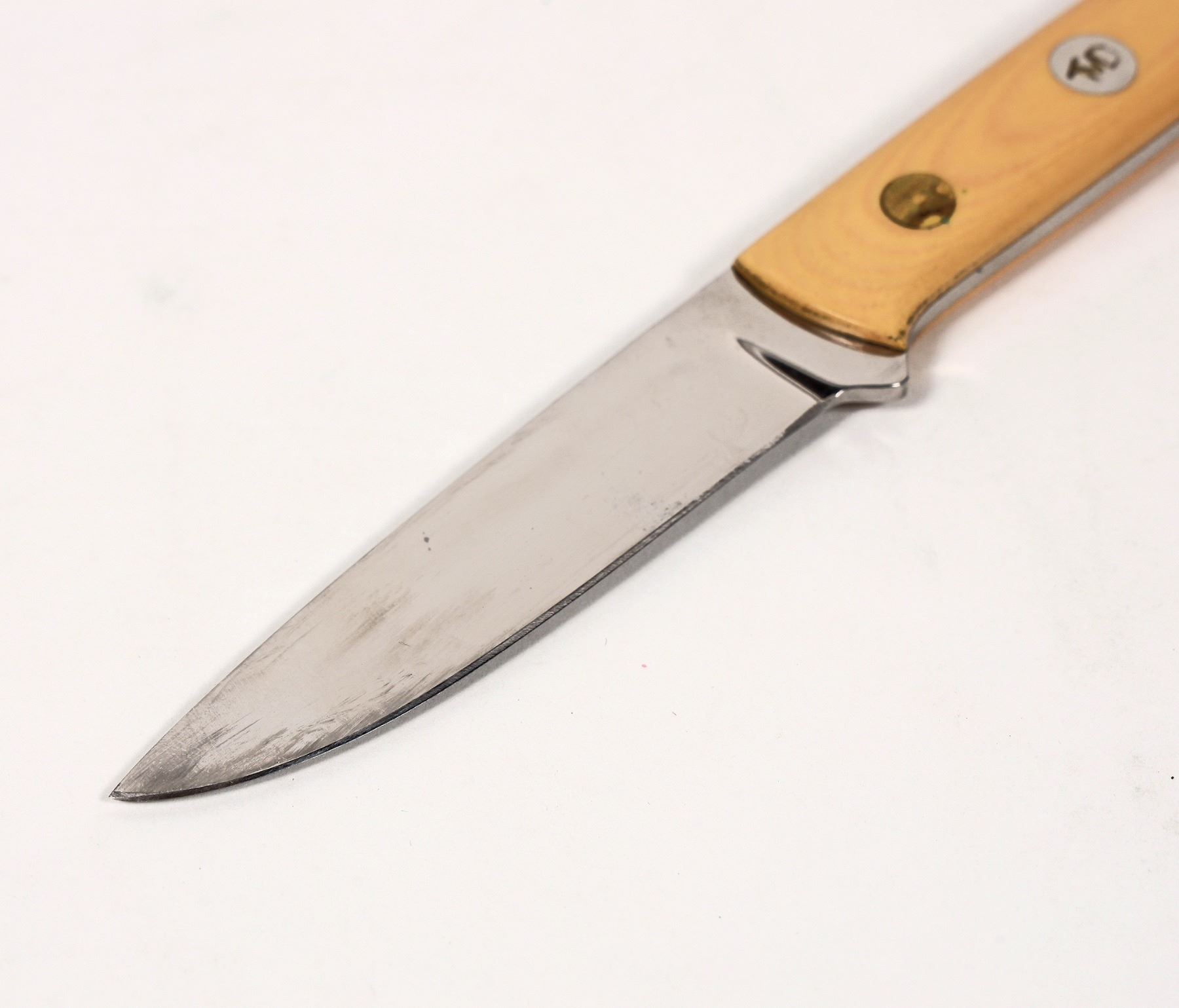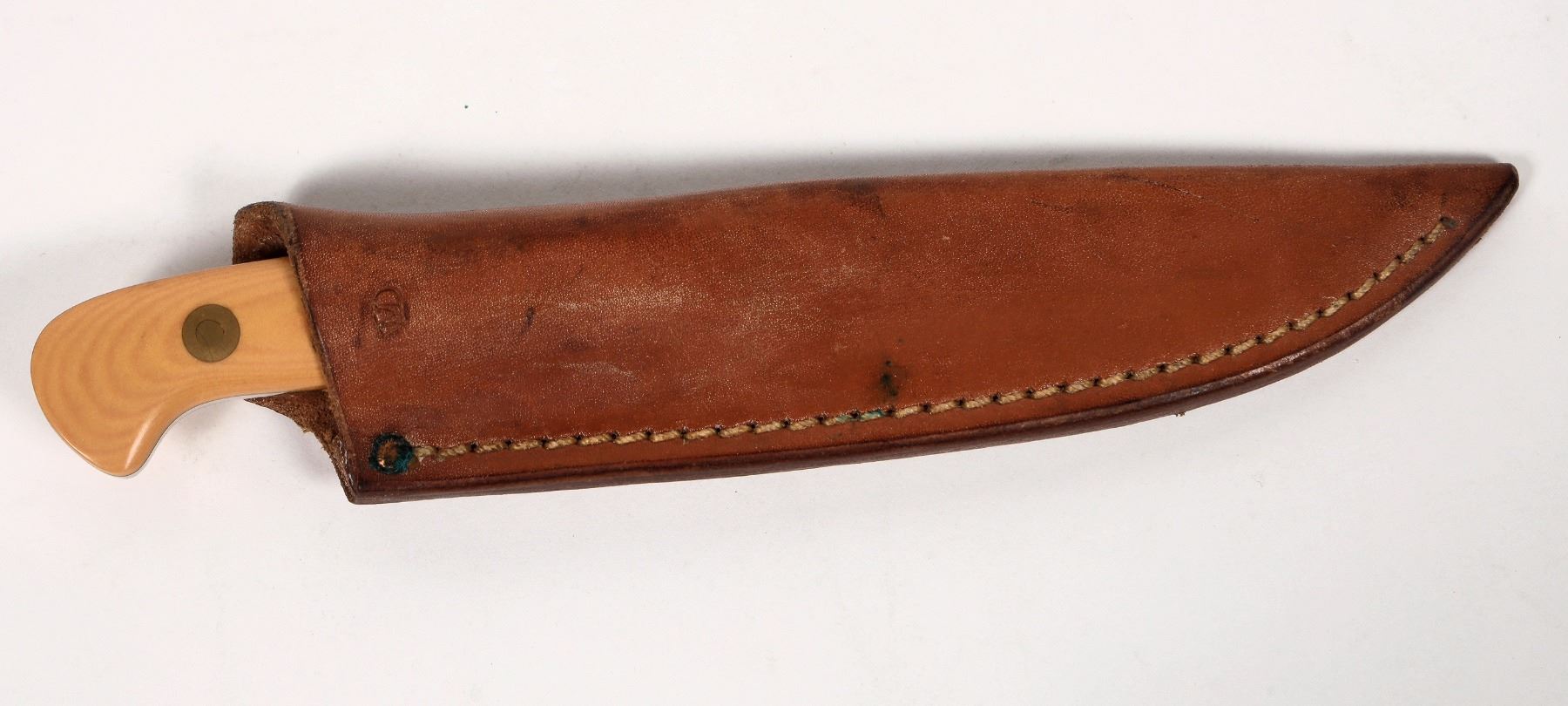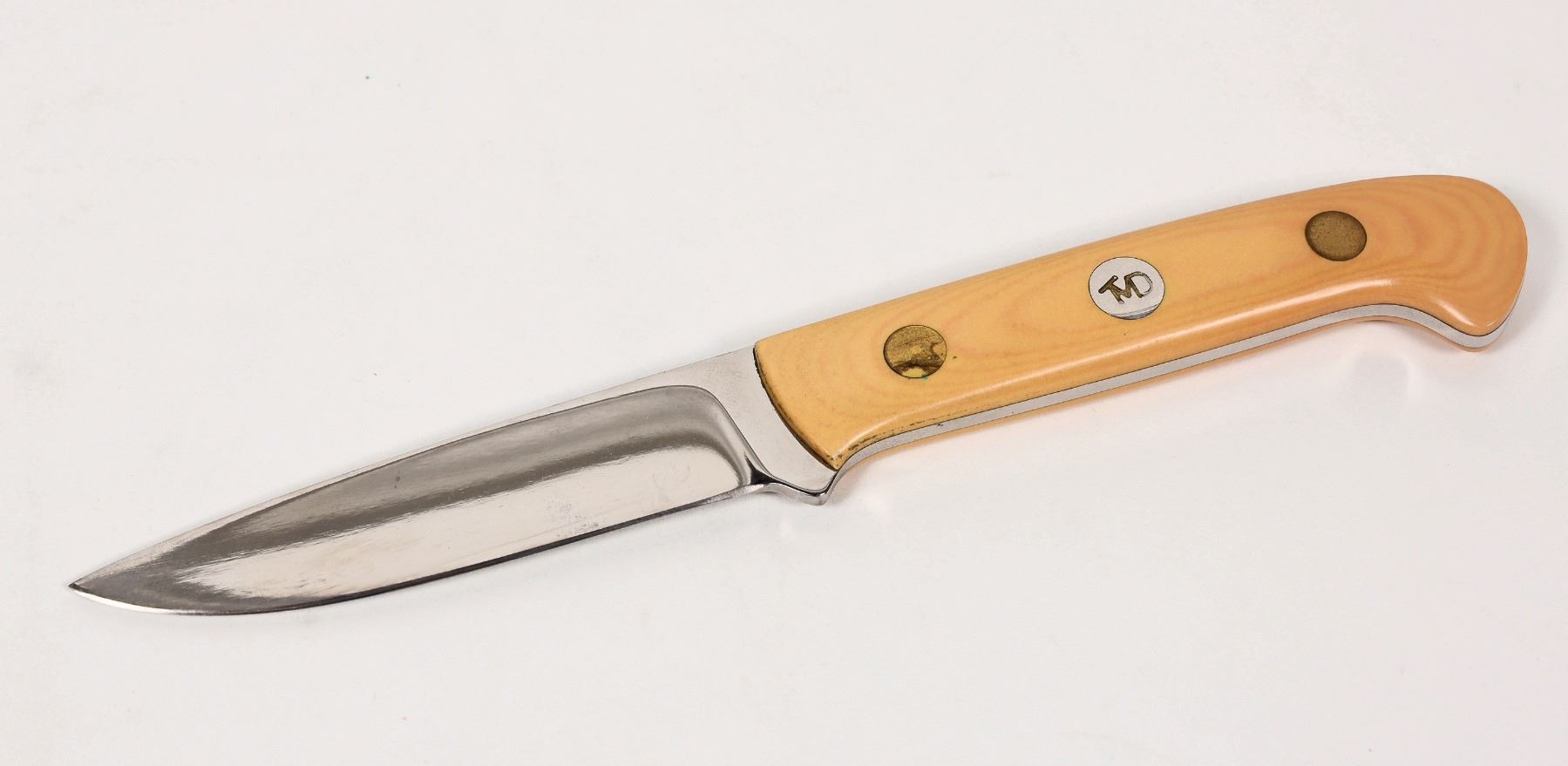 This knife was made by custom knife maker Ted Dowell of Bend, Oregon; (1929-2012). It appears to be a "lightweight" (at 3.0 oz.) made with D-2 or 440-C steel and ivory micarta scales. It is a tang blade with brass rivets and the familiar round makers mark with TMD in the center. New, never used with matching sheath also with the TMD logo at the throat. Ted was a founding father of the Knife Makers Guild and first president of that guild. A Rare find. 7.625 in. overall length, 3.625 in. straight back blade highly polished. C. 1970s. Please see photo for details.