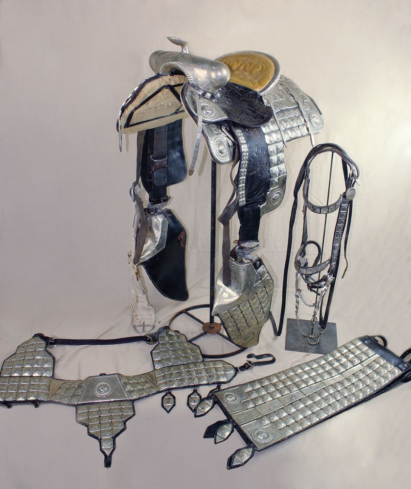 Very attractive parade saddle, all complete with bridle, breast collar and serapes. A flashy, eye-catching saddle with the horsehead pattern.