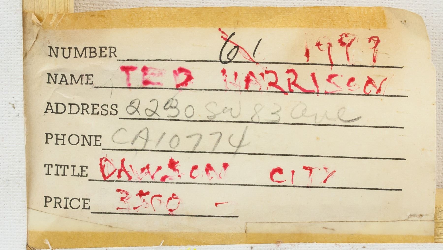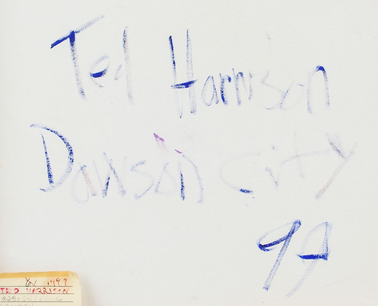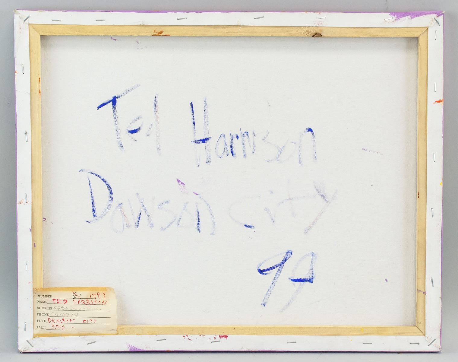 Oil on canvas. Featuring an abstract landscape scene. Signed Ted Harrison and inscribed 94 beside signature on the lower left corner. Also inscribed on verso Ted Harrison / Dawson City / 94. Label on verso inscribed NUMBER: 1999 / NAME: TED HARRISON / ADDRESS: 2230 SW 83 AVE / PHONE: CA10774 / TITLE: DAWSON CITY / PRICE: 3500-. Attributed to Ted Harrison (1926-2015, British-Canadian). 40 x 50 cm (15.75 x 19.75 inches). Provenance: This lot carries limited provenance from a Toronto estate