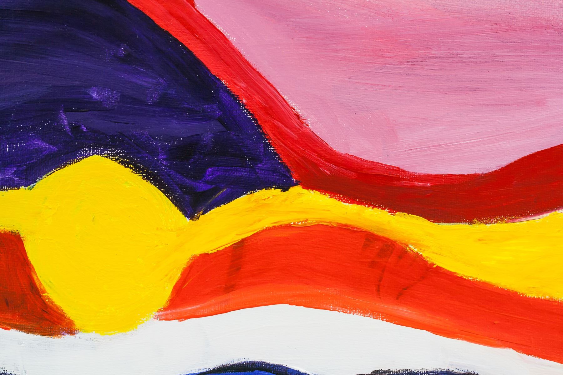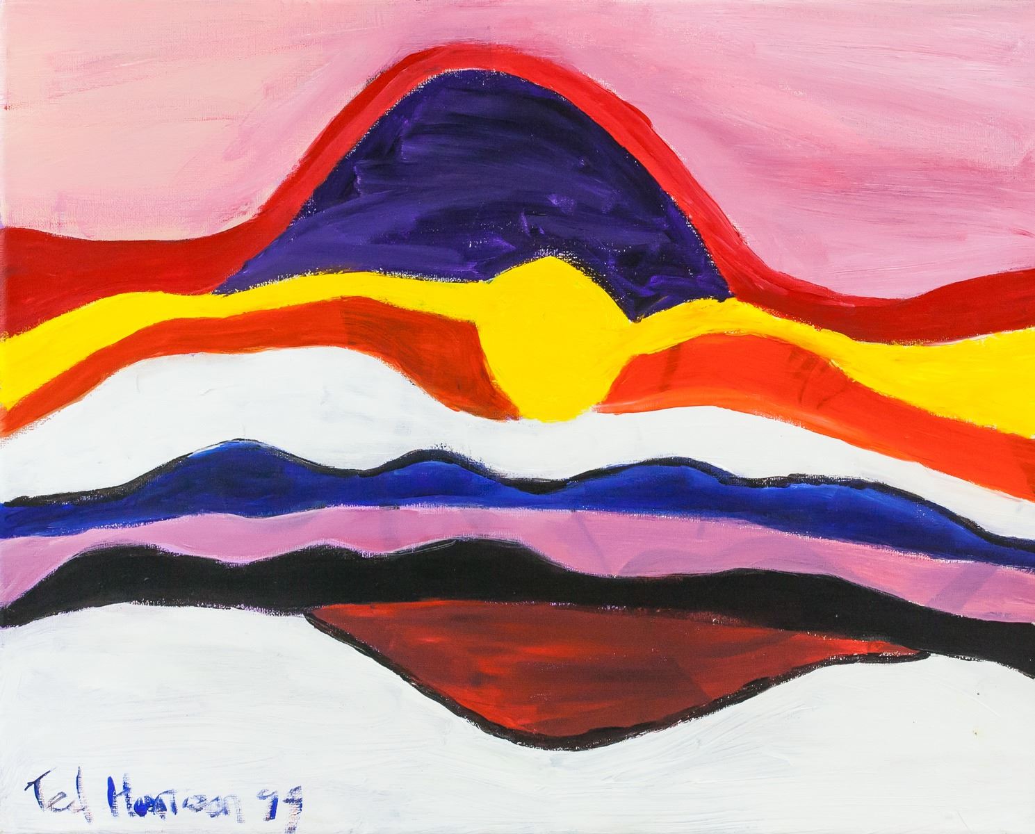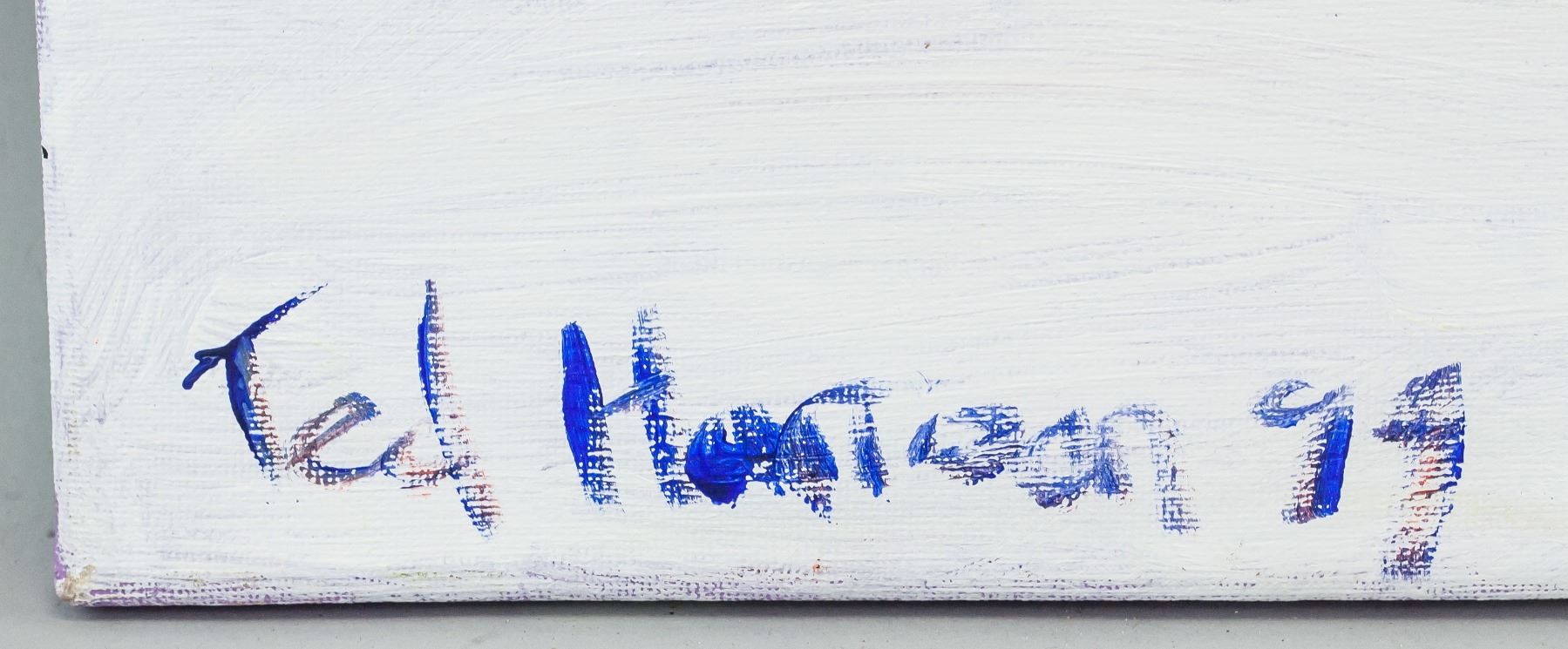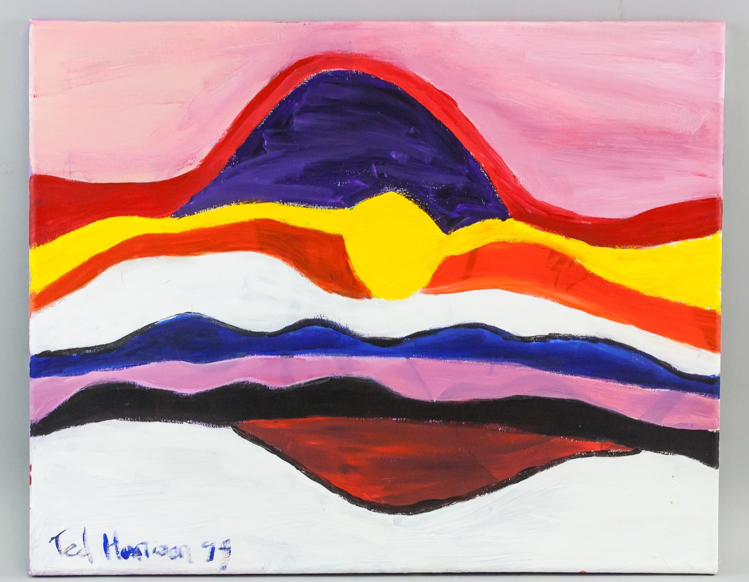 Oil on canvas. Featuring an abstract landscape scene. Signed Ted Harrison and inscribed 94 beside signature on the lower left corner. Also inscribed on verso Ted Harrison / Dawson City / 94. Label on verso inscribed NUMBER: 1999 / NAME: TED HARRISON / ADDRESS: 2230 SW 83 AVE / PHONE: CA10774 / TITLE: DAWSON CITY / PRICE: 3500-. Attributed to Ted Harrison (1926-2015, British-Canadian). 40 x 50 cm (15.75 x 19.75 inches). Provenance: This lot carries limited provenance from a Toronto estate