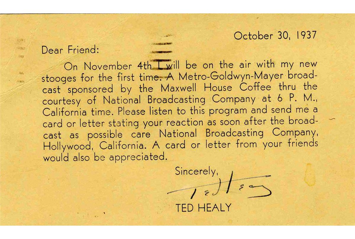 Ted Healy Signed Postcard -- 1937 -- ''...I will be on the air with my new Stooges for the first time...'' -- Near Fine