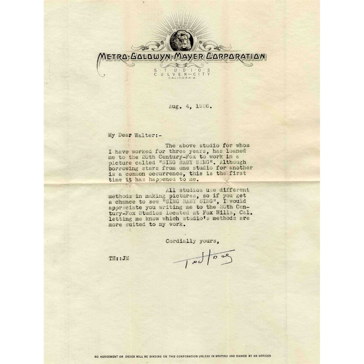Ted Healy typed letter signed on Metro-Goldwyn-Mayer Corporation letterhead regarding his film career. Dated 4 August 1936, Healy writes to his friend Walter Kolarik, requesting that he see Healy's film ''Sing Baby Sing'' for which Healy was traded to 20th Century Fox. In part, ''...Although borrowing stars from one studio...is common…this is the first time it has happened to me...'' Letter measures 10.75'' x 8.75'', in fine condition. Folded in sixths for inclusion into envelope, also present.