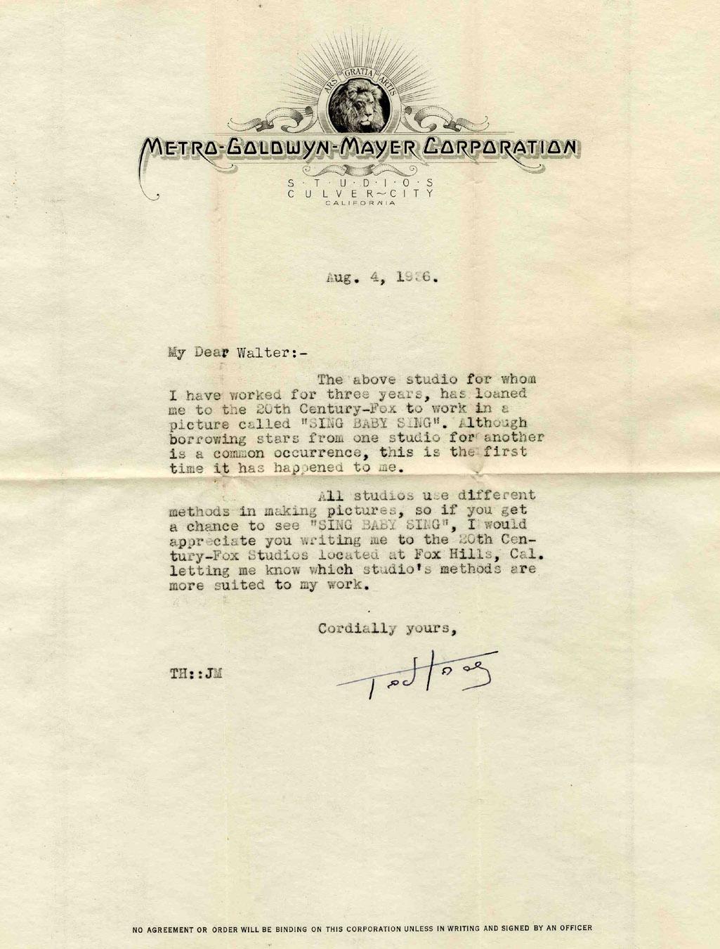 Ted Healy typed letter signed on Metro-Goldwyn-Mayer Corporation letterhead regarding his own film career. In this letter dated 4 August 1936, Healy writes to his friend Walter Kolarik, requesting that he see Healy's film ''Sing Baby Sing'' for which Healy was traded to 20th Century Fox. He writes, ''Although borrowing stars from one studio…is common…this is the first time it has happened to me.'' Letter measures 10.75'' x 8.75'' and is in fine condition. Folded in sixths for inclusion into envelope, also present.