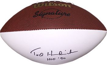 Ted Hendricks played nine seasons with the Raiders before retiring after the 1983 season. In the 1978 season Hendricks recorded a stellar season with 78 tackles, 6 sacks, 3 interceptions, 8 passes defensed and 2 fumble recoveries. The defense tied for 4th in most interceptions in the NFL and scored 4 defensive touchdowns which tied them for 2nd most in the NFL. They were tied for 10th in fewest points allowed as well. Again, for the third consecutive season, Ted was second-team All-Pro in 1978. Ted Hendricks has hand autographed this Wilson Signature football (3 White Panels and 1 Brown Panel) with HOF 90 inscription. Certificate of Authenticity from Athlon Sports Collectibles.
