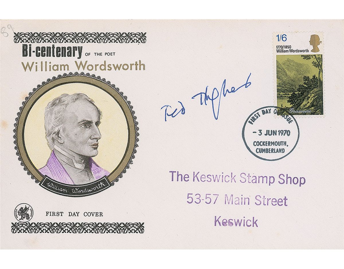 English poet and children's writer (1930–1998), who was married to Sylvia Plath from 1956 until her suicide in 1963. FDC, 6.25 x 4.25, with a cachet honoring the bicentenary of the poet William Wordsworth, signed in blue ballpoint by Hughes. In fine condition, with a few light spots of discoloration.