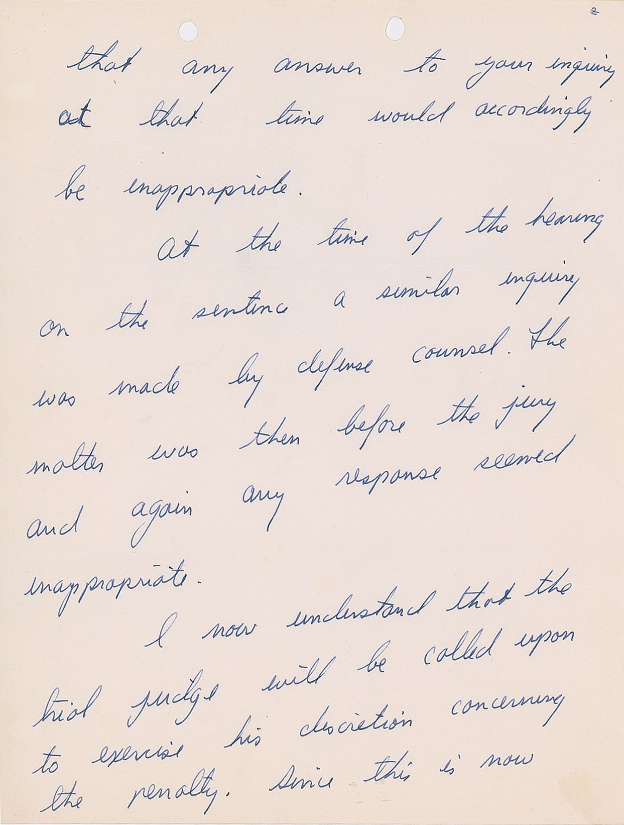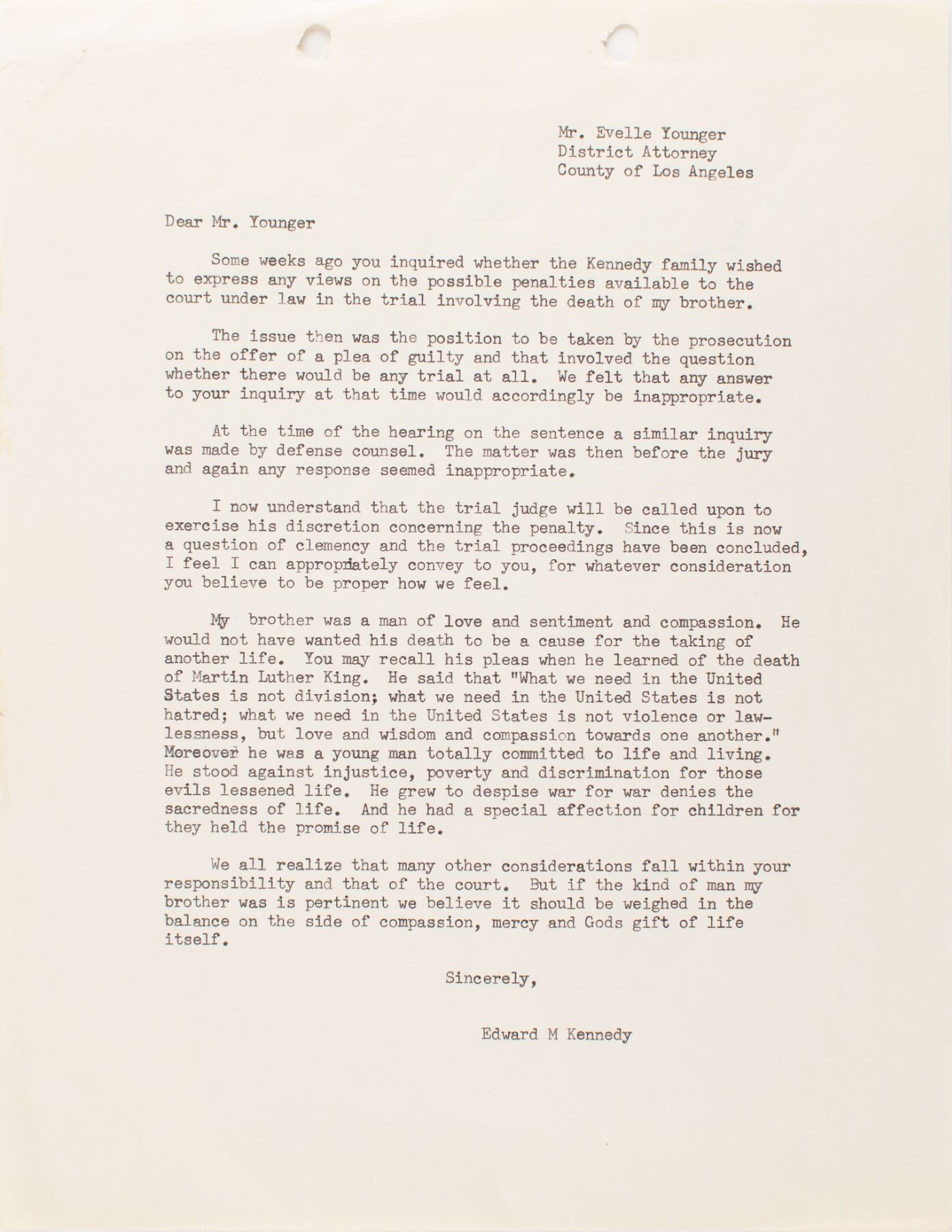 After finding Sirhan Sirhan guilty of murder in the first degree, District Attorney Evelle J. Younger asked the Kennedy family if they had any comments or recommendations relative to the penalty in this case, which was death in the electric chair. At this time in California a judge could if he wanted to as a form of clemency reduce the punishment of death to life imprisonment. The following 5-page Ted Kennedy letter to the court represented the Kennedy family position in regards to the death penalty Sirhan Sirhan faced. It wasn't until 1972 that the death sentence was eliminated as punishment in California for first degree murder and replaced by life imprisonment without the chance of parole. This also meant that all prisoners who were on death row at the time and waiting for execution had their sentences converted to life imprisonment which became the case for Sirhan Sirhan.