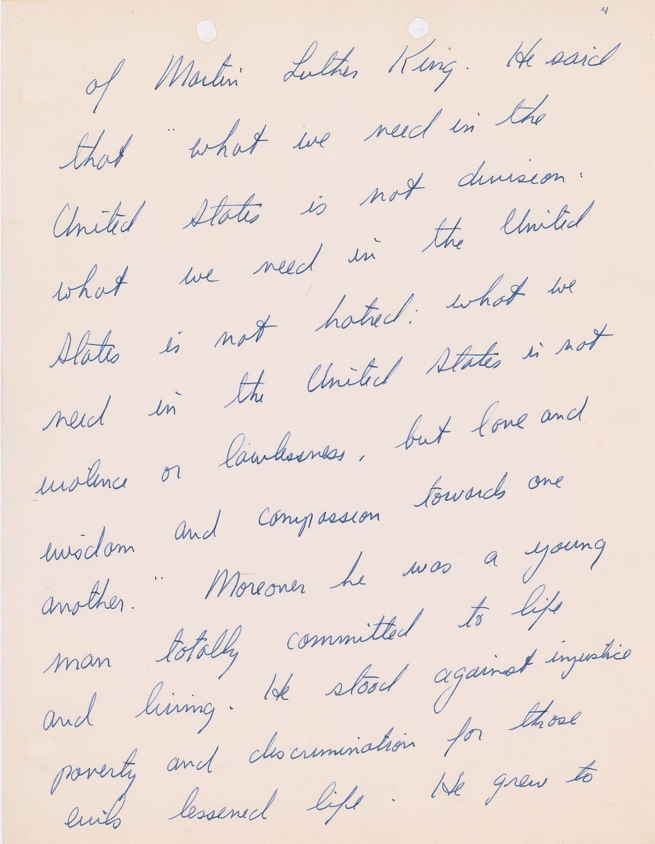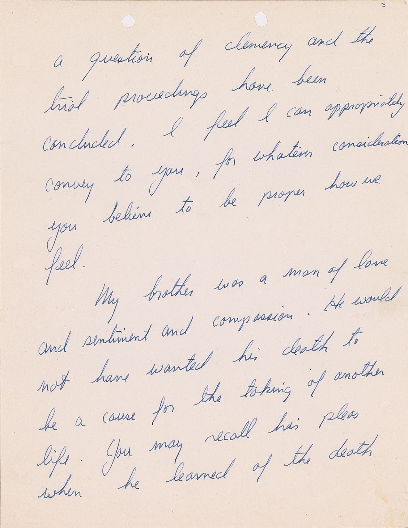 In part: "My brother was a man of love and sentiment and compassion. He would not have wanted his death to be a cause for the taking of another life. You may recall his pleas when he learned of the death of Martin Luther King. He said that 'what we need in the United States is not division. What we need in the United States is not hatred. What we need in the United States is not violence or lawlessness, but love and wisdom and compassion towards one another.' Moreover he was a young man totally committed to life and living. He stood against injustice, poverty, and discrimination for those evils lessened life. He grew to despise war for war denies the sacredness of life. And he had a special affection for children for they held the promise of life. We all realize that many other considerations fall within your responsibility and that of the court. But if the kind of man my brother was is pertinent we believe it should be weighed in the balance on the side of compassion, mercy and God's gift of life itself."