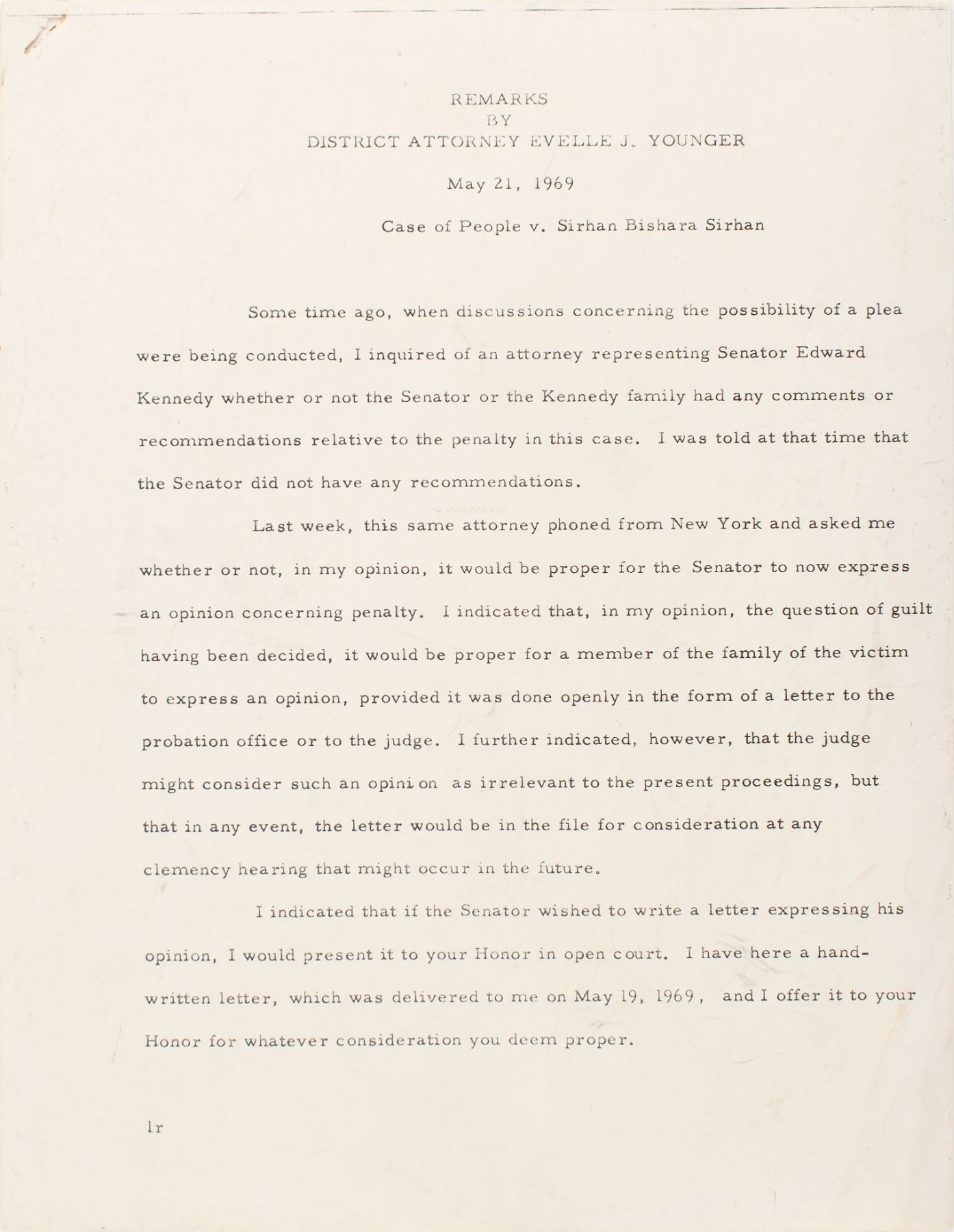 Ted Kennedy 5-page ALS May 18, 1969 to Mr. Evelle Younger District Attorney who prosecuted Sirhan Sirhan for the assassination of Robert F. Kennedy, Remarks by District Attorney Evelle J. Younger May 21, 1969 Case of People v. Sirhan Bishara Sirhan.