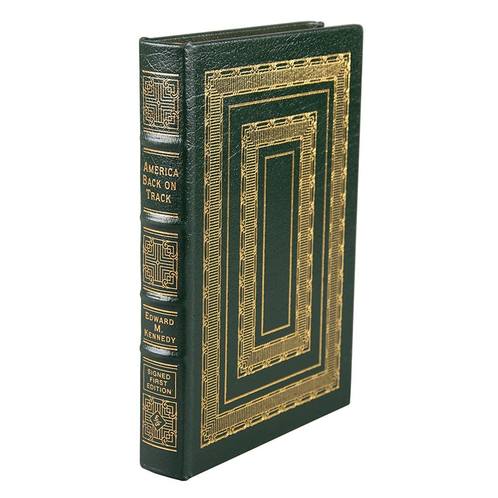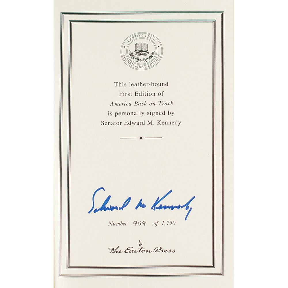 Signed book: America Back on Track. Limited first edition, numbered 959/1750. Norwalk, CT: Easton Press, 2006. Leather-bound hardcover, 6.25 x 9.25, 210 pages. Signed on the colophon in blue felt tip, "Edward M. Kennedy." In very fine condition. Accompanied by a certificate of authenticity from the publisher.