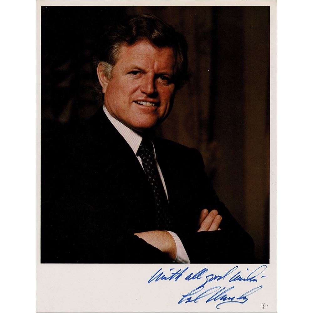 Color semi-glossy 8.5 x 11 photo print of Ted Kennedy with his arms folded, signed in the lower border in blue felt tip, "With all good wishes—Ted Kennedy." In fine condition, with a faint paperclip impression to the top edge.