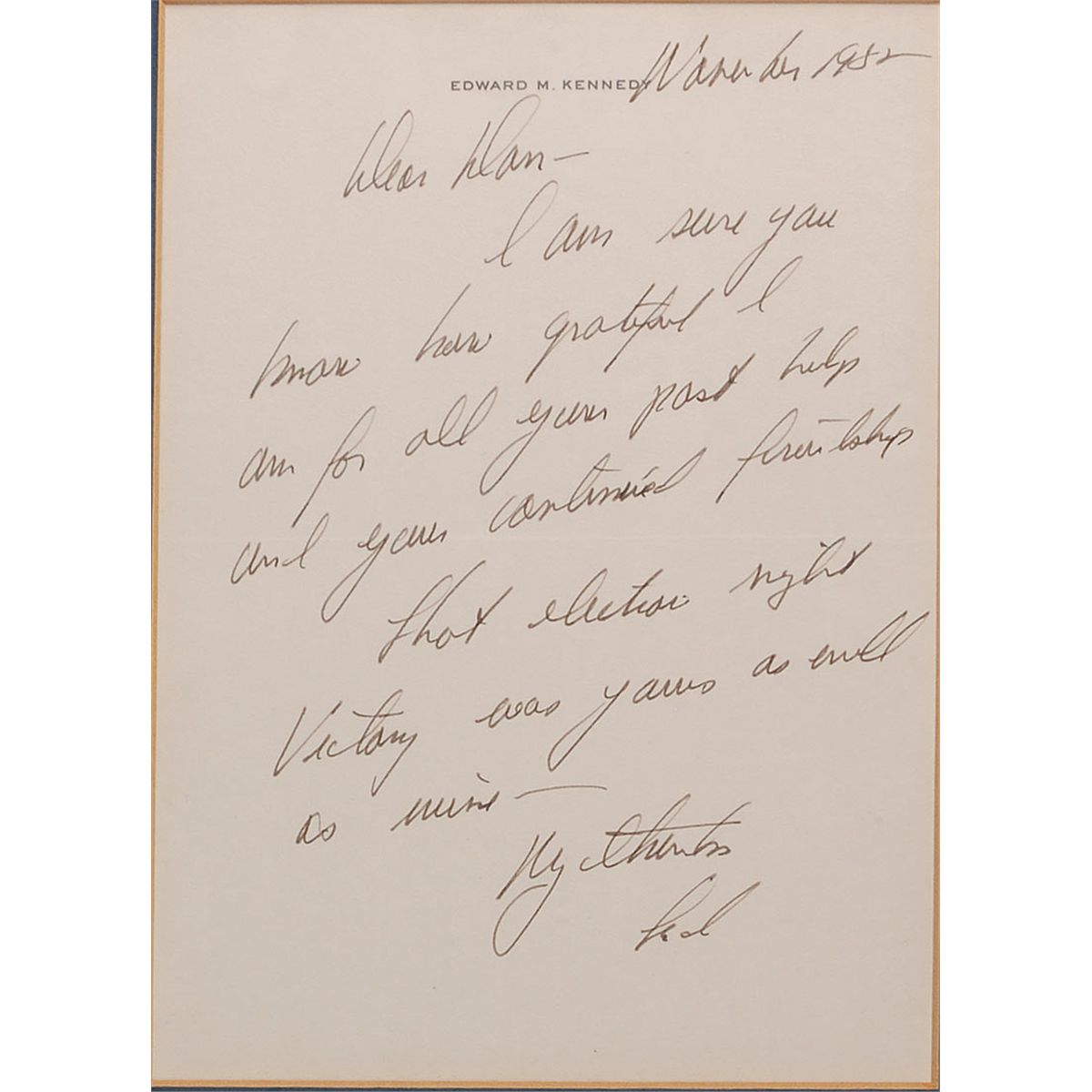 ALS signed “Ted,” one page, 6 x 8.25, personal letterhead, November 1982. Letter to longtime family friend and supporter Donald Dowd. In full: “I am sure you know how grateful I am for all your past help and your continued friendship. That election night victory was yours as well as mine.” Matted and framed to an overall size of 9.75 x 13. In fine condition.