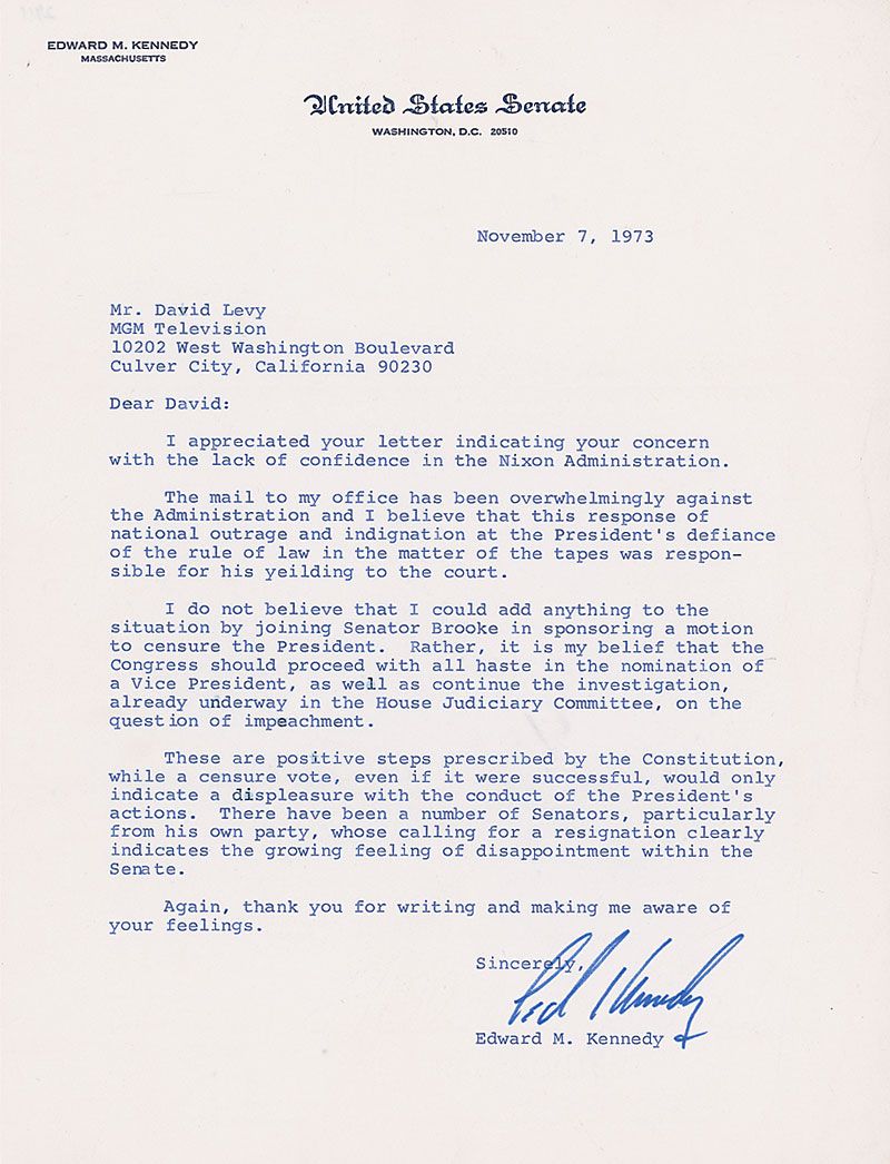 TLS, one page, 8 x 10.5, US Senate letterhead, November 7, 1973. Letter to a concerned citizen. In part: “I appreciated your letter indicating your concern with the lack of confidence in the Nixon Administration…I believe that this response of national outrage and indignation at the President’s defiance of the rule of law in the matter of the tapes was responsible for his yielding to the court…the Congress should proceed with all haste in the nomination of a Vice President, as well as continue on the investigation…on the question of impeachment.” In fine condition.