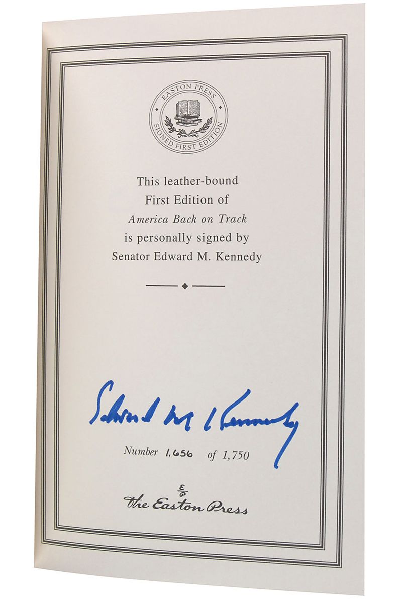 Signed book: America Back on Track. Limited first edition of 1720 copies (this being No. 1656). Connecticut: Easton Press, 2006. Hardcover, 6.25 x 9.25, 210 pages. Signed on the colophon in blue felt tip. “Edward M. Kennedy.” In fine condition.