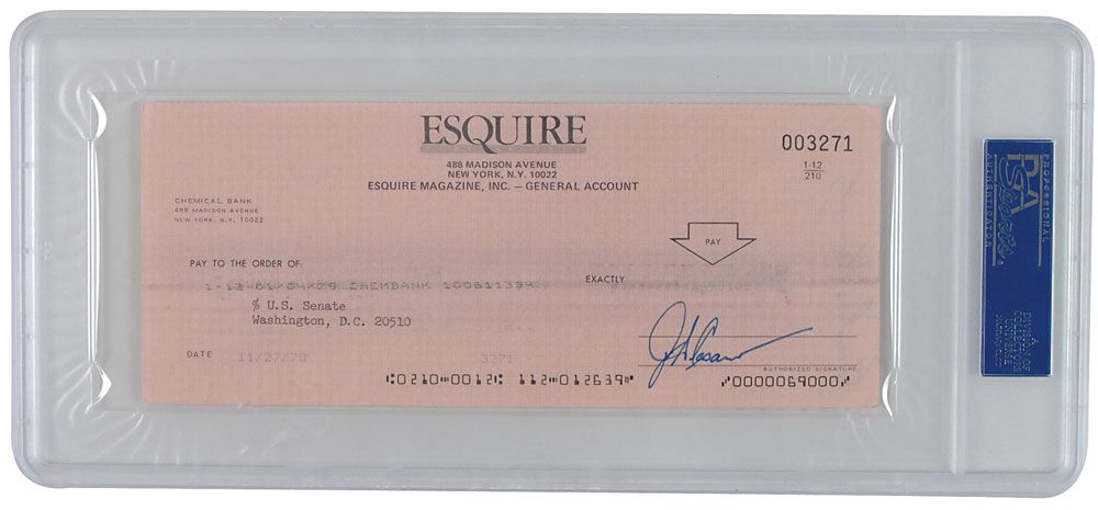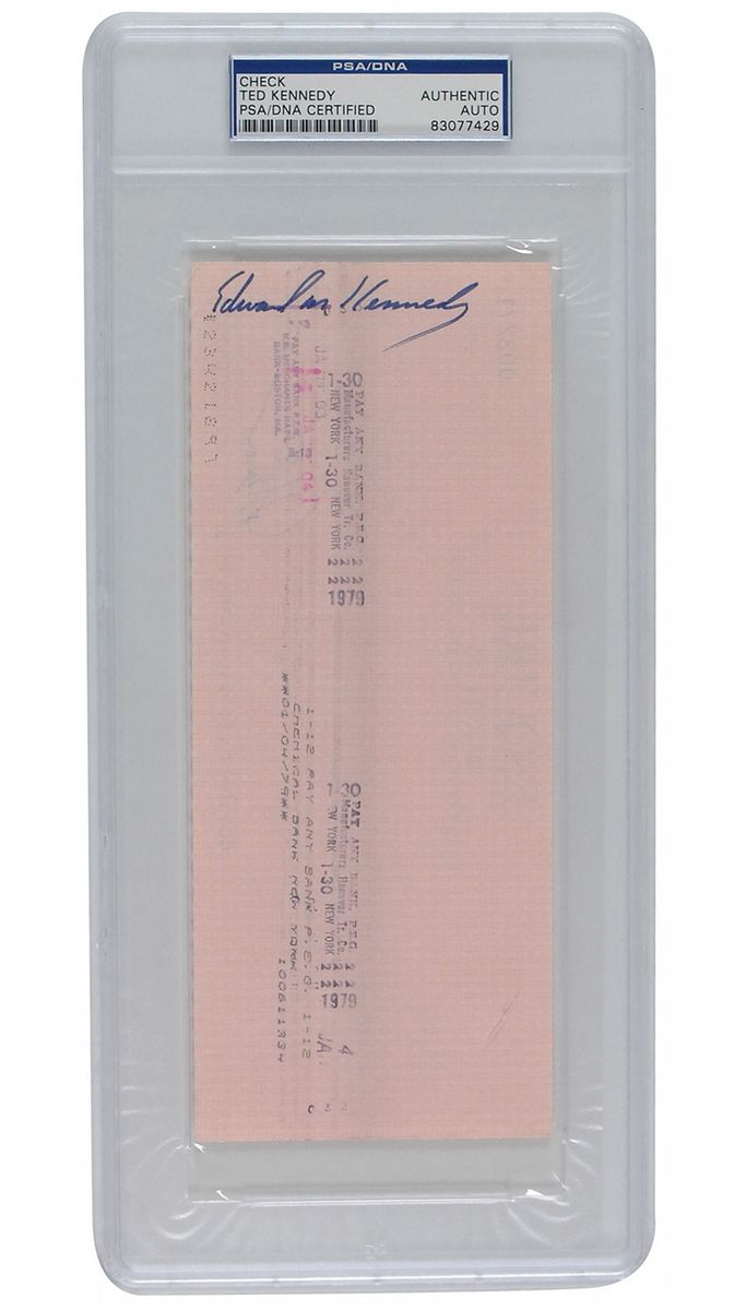 Endorsed business check, 8.5 x 3.5, drawn on the account of Esquire Magazine, payable to Edward M. Kennedy for $690.00, November 27, 1978, and endorsed by Kennedy on the back, “Edward M. Kennedy.” Encapsulated in a plastic PSA/DNA authentication holder. In fine condition, with expected cancellation stamps on the reverse, just touching the signature.