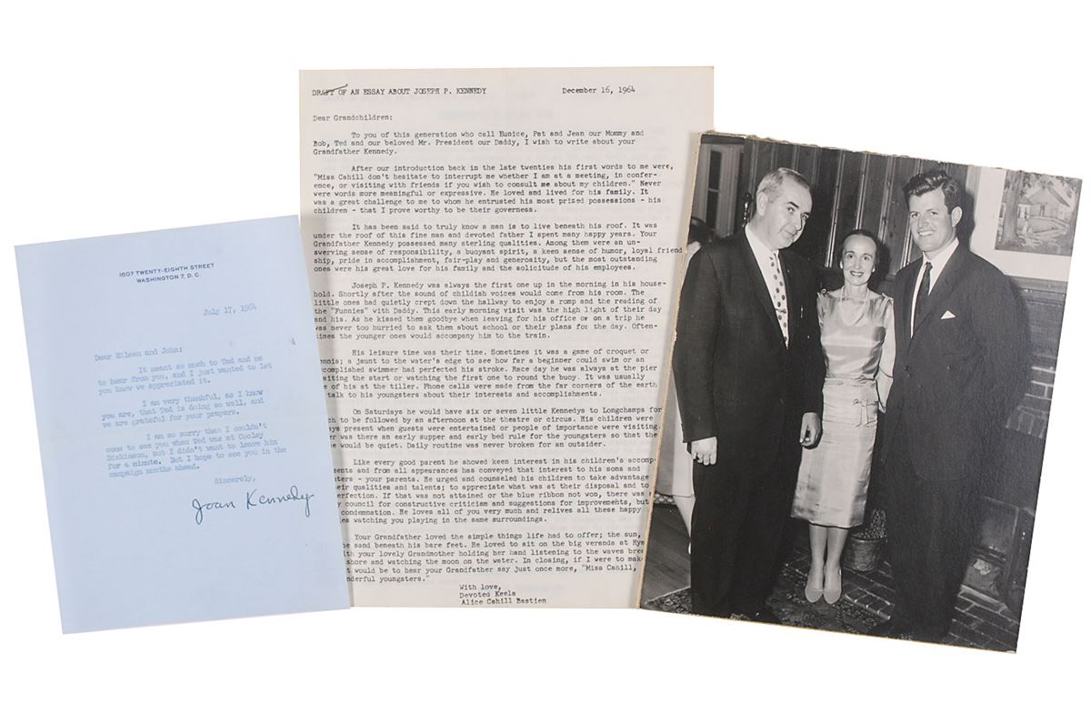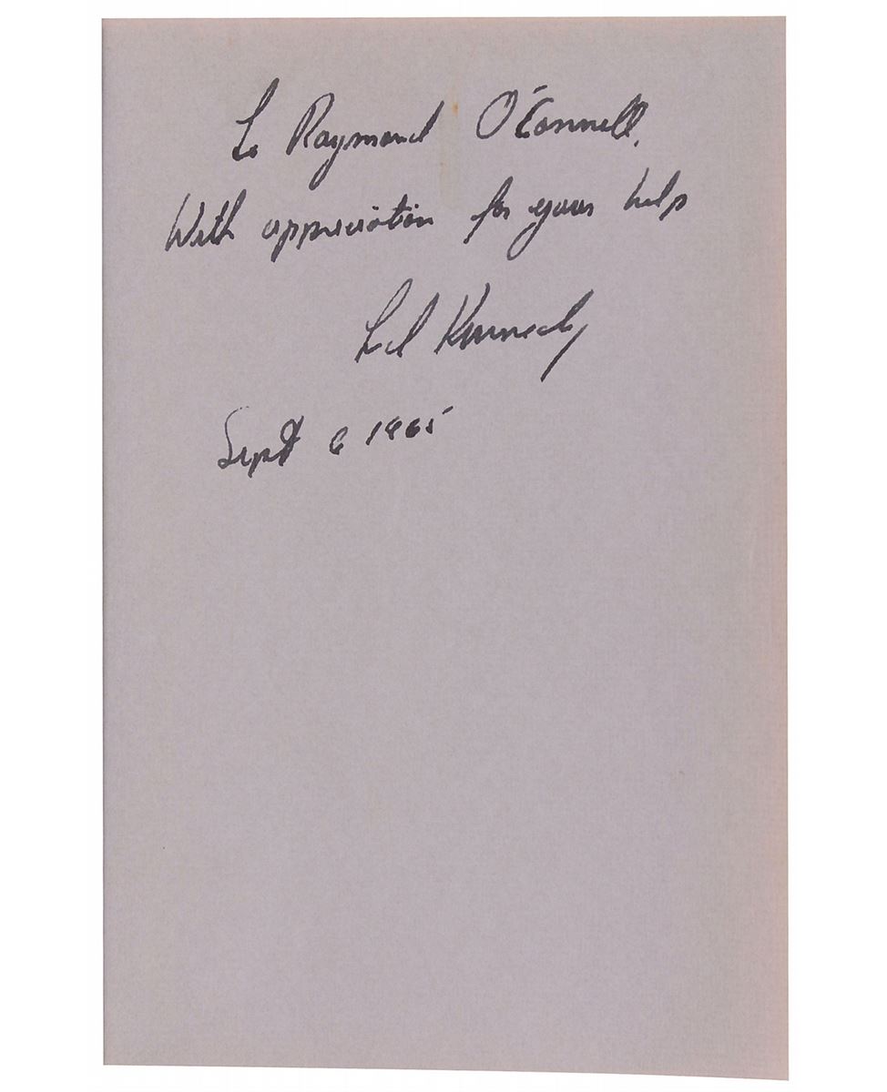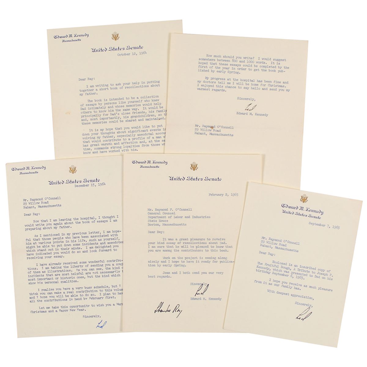 Collection of four TLSs from Ted Kennedy to Department of Labor lawyer Ray O'Connell, signed “Ted,” totaling five pages, United States Senate letterhead, dated 1964–1965. The earliest, October 12, 1964, in part: “I am writing to ask for your help in putting together a short book of recollections about my father…intended to be a collection of essays by persons like yourself who knew my Dad intimately and whose memories would help others to know him the same way.” Kennedy’s other letters reference the project and its progress. Includes a presentation copy of the book, entitled The Fruitful Bough, privately printed in 1965, hardcover, 6.25 x 9.25, 288 pages, signed and inscribed on the first free end page in black felt tip, “To Raymond O’Connell, With appreciation for your help, Ted Kennedy, Sept 6 1965.” Light foxing and dampstaining to interior of the book, otherwise overall fine condition. Accompanied by an unrelated TLS from Joan Kennedy, an unsigned photo of Kennedy with O’Connoll, and photocopies of three different essays about Joseph Kennedy.