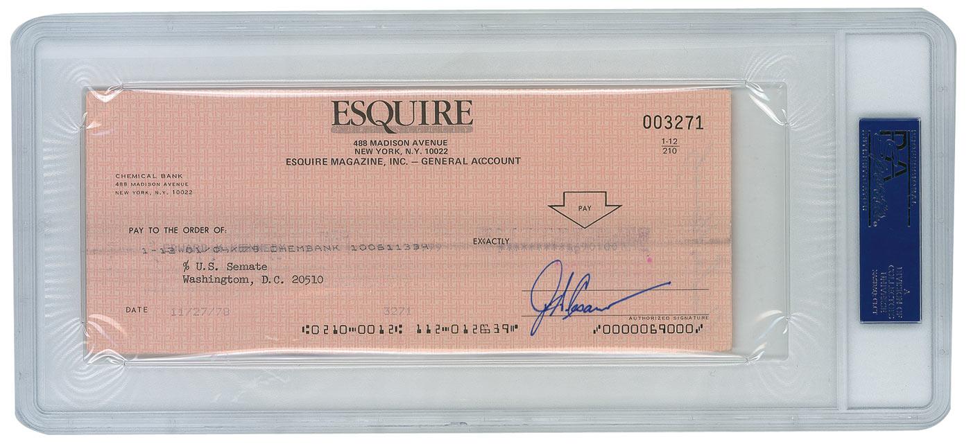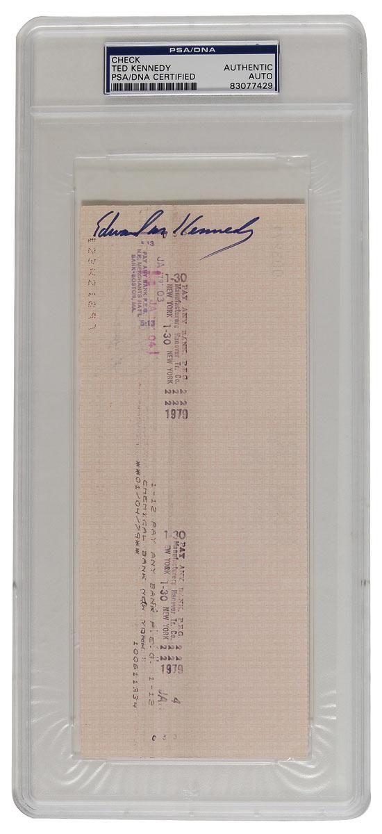 Business check, 8.5 x 3.5, drawn on the account of Esquire Magazine, payable to Edward M. Kennedy for $690.00, November 27, 1978, and endorsed by Kennedy on the back as “Edward M. Kennedy.” Encapsulated in a plastic PSA/DNA authentication holder. In fine condition, with expected cancellation stamps on the reverse, just touching the signature. RRAuction COA.
