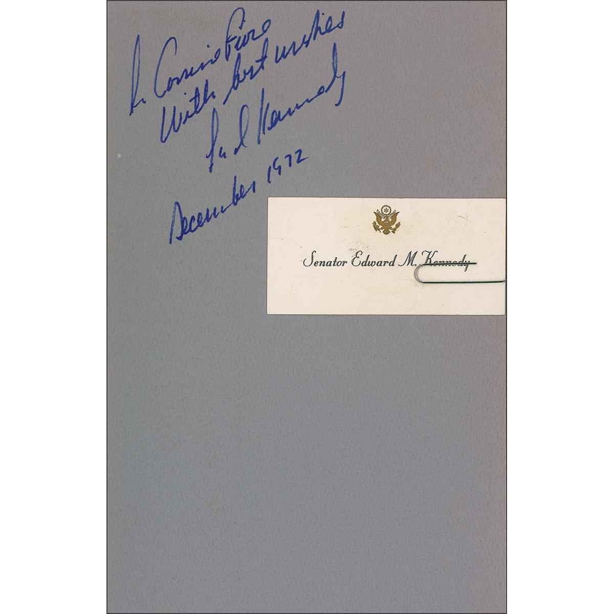 Signed book: In Critical Condition: The Crisis in America's Health Care. First edition, first printing. NY: Simon & Schuster, 1972. Hardcover with dustjacket, 5.75 x 8.5. Signed and inscribed in blue felt tip on the first free end page, “To Corrine Fure, With best wishes, Ted Kennedy, December 1972.” In fine condition, with very light toning and soiling to the pastedown of the front board and mild staining of the front and back cover. The dustjacket shows scattered creasing and a few spots of soiling.