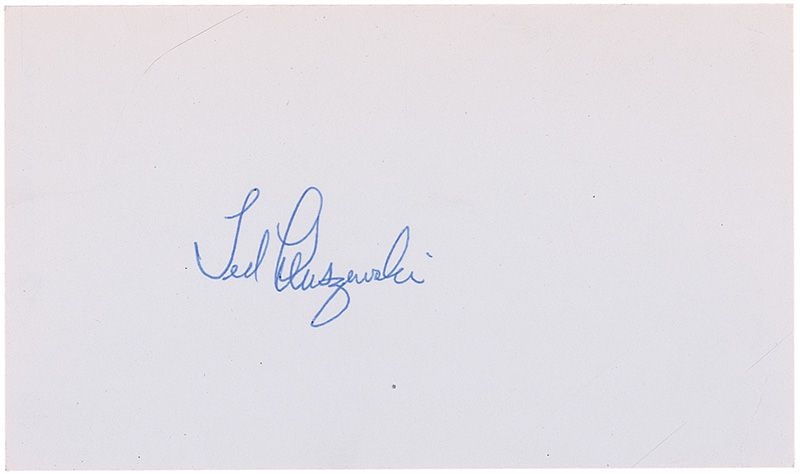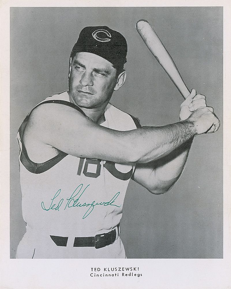 Two items: one semi-glossy 8 x 10 photo of Kluszewski at bat for Cincinnati, signed in green ballpoint; and a blue ballpoint signature, “Ted Kluszewski,” on a white 5 x 3 card. In fine condition, with a few light scattered creases.