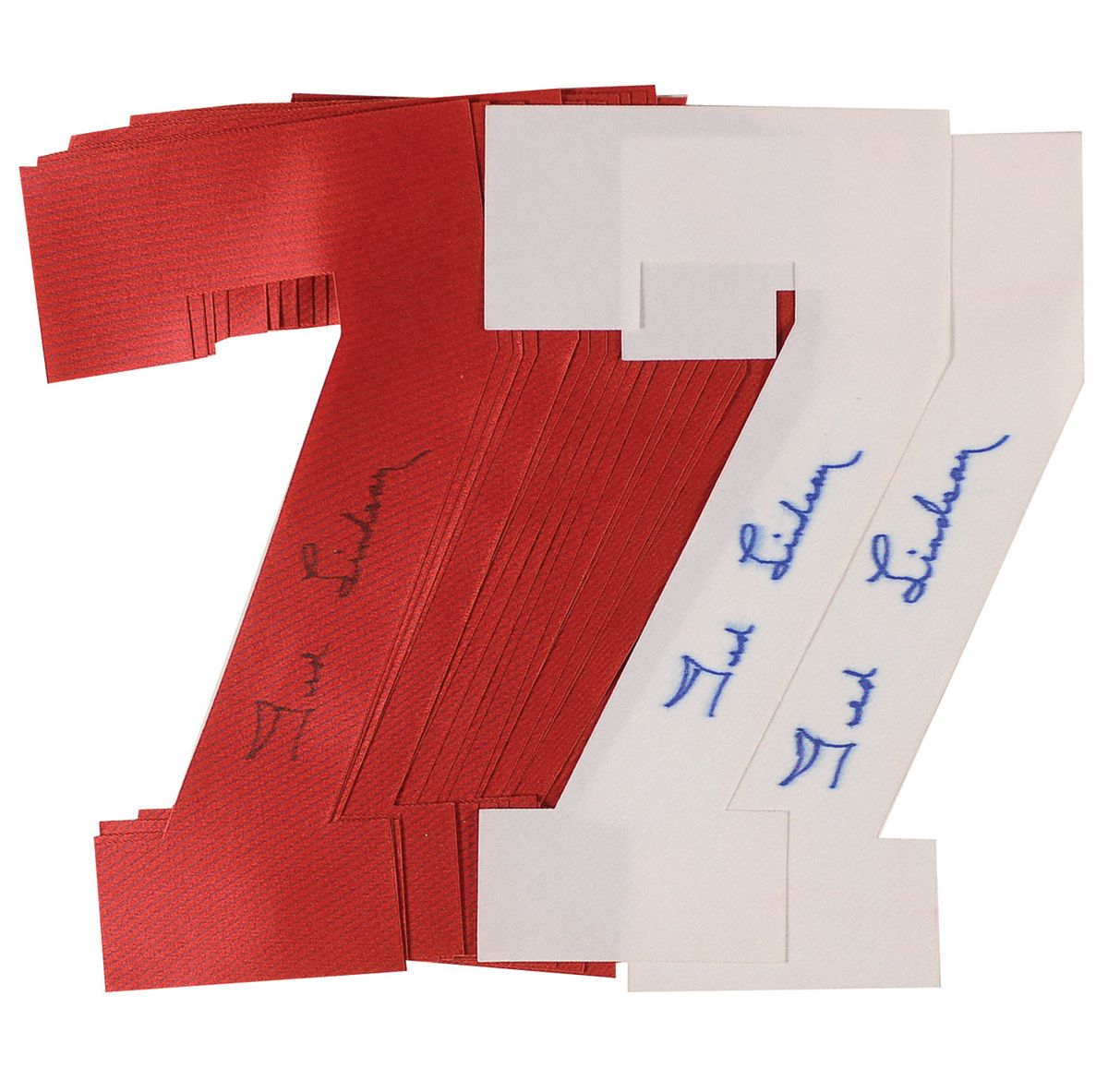 Detroit Red Wing icon and NHL Hall of Famer. Eighteen jersey number ‘7s,’ each measuring 12? high, 16 red and two white, each signed in blue or black felt tip. In fine condition, with some light haloing or feathering to a few signatures. The numbers can be adhered to jerseys.
