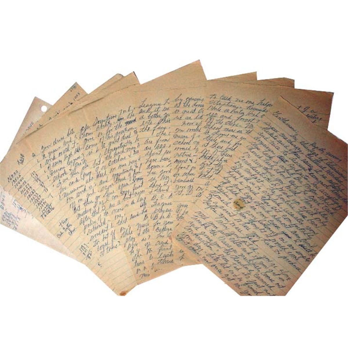 1959 baseball speech handwritten by Chicago White Sox Hall of Famer Ted Lyons. Composed on lined notebook paper, speech runs seven pages, all penned in Lyons' own hand. Excerpt: ''...When you pitch - you go along with your best shots and if you get in trouble the Manager mercifully comes out and gives you the standard canned conversation 'Well Ted it's just not your day - Let's let so & so finish up'...'' Seven page speech is augmented with three pages of Lyons' financial notes. Measures 8'' x 10''. Overall toning, else near fine.