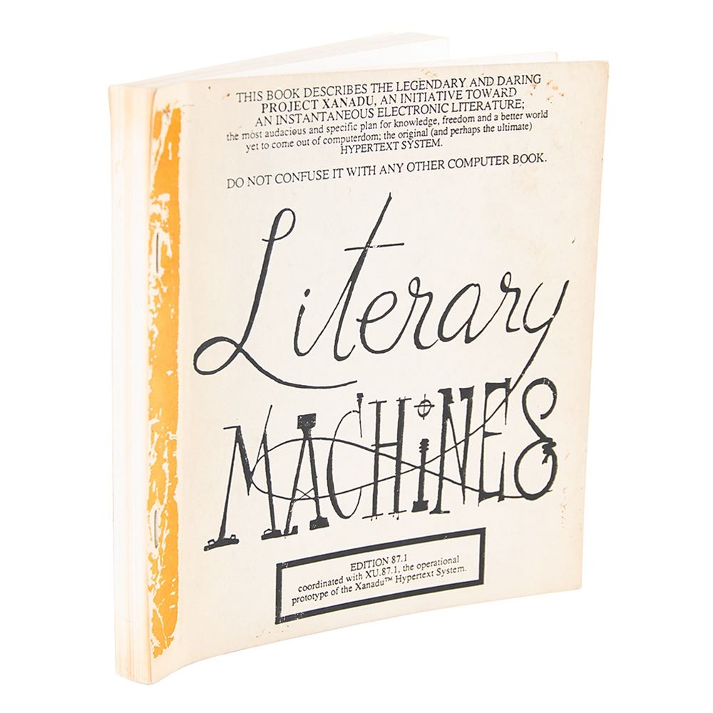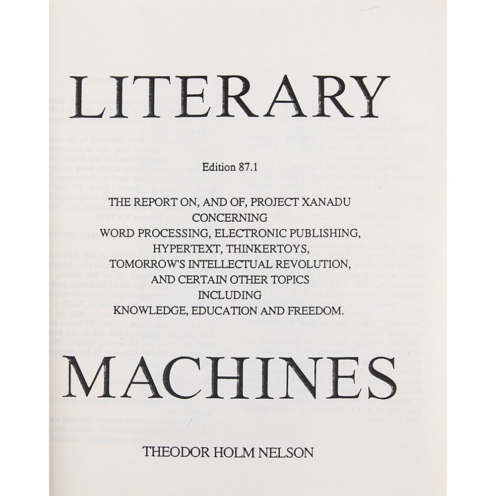Scarce unsigned book: Literary Machines, Edition 87.1 by hypertext pioneer Ted Nelson. Self-published, 1987. Staple-bound softcover, 7.75 x 8.5, 263 pages. In fine condition, with toning and staining to the covers and spine edges.